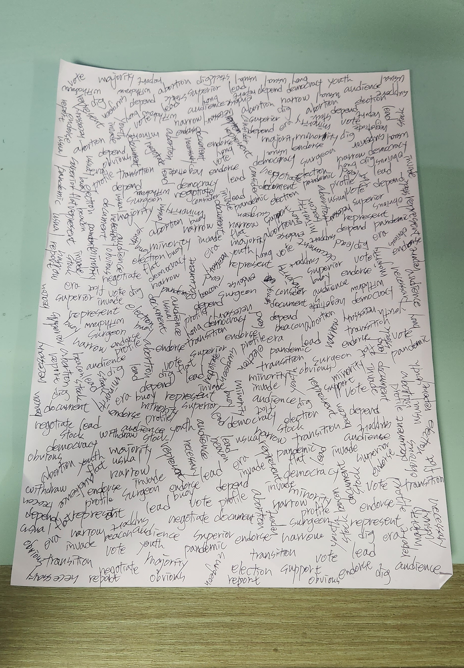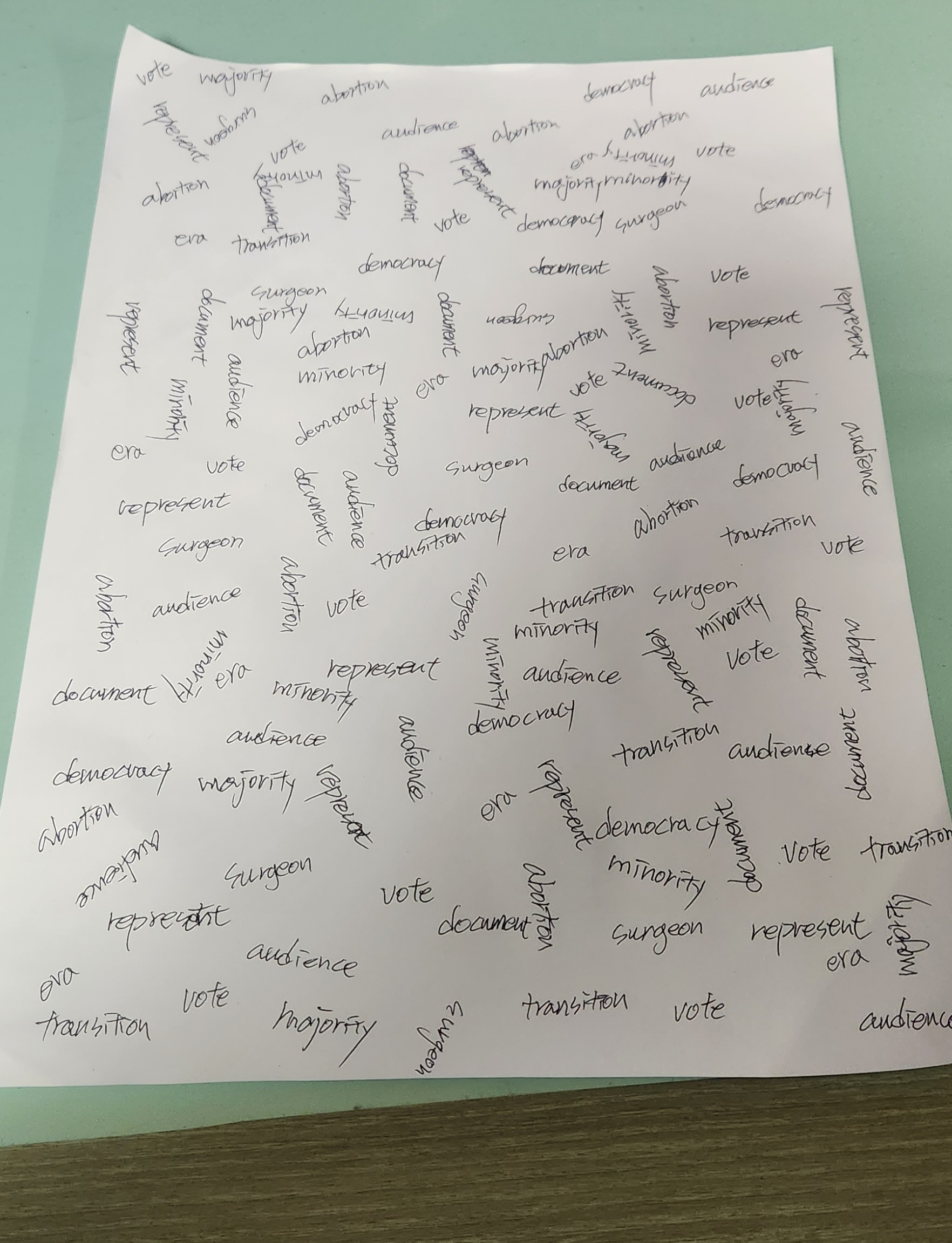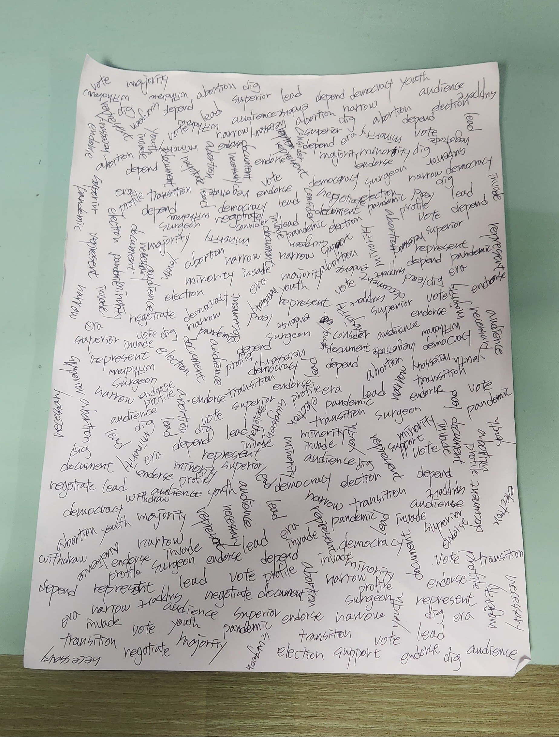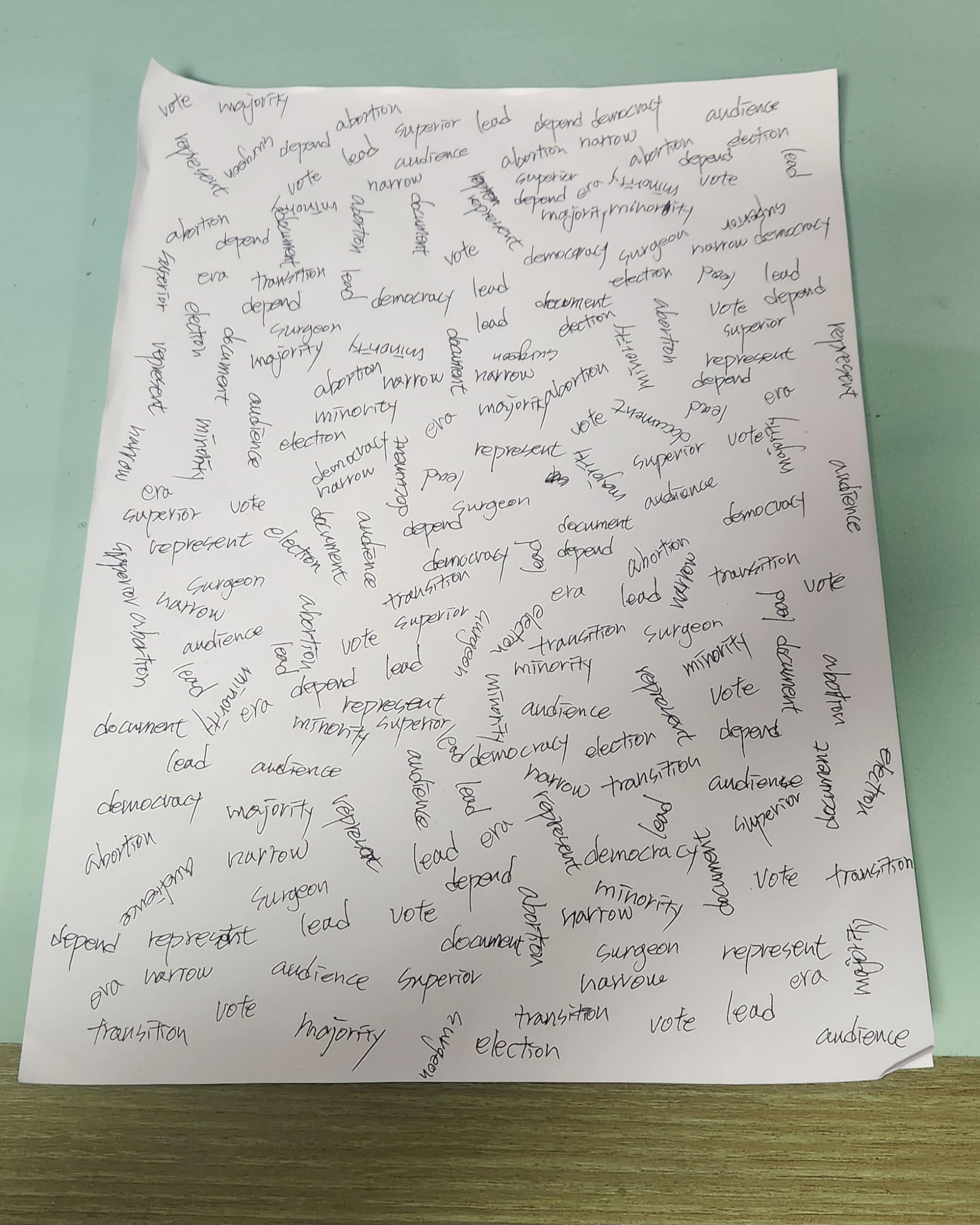 이렇게 하면서 백지에 규칙 없이 단어들을 무작위로 써 내려가면 된다. 빈틈없이 쓰면 좋으니 정면에서만 쓰지 말고 연습장을 옆으로 돌려서도 써 보고, 거꾸로 해서도 써 보자. 빈 곳을 채운다는 생각으로.