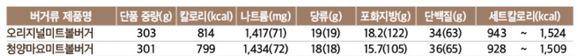 칼로리 정보는 맘스터치 홈페이지에서 확인할 수 있는데 위와 같다.