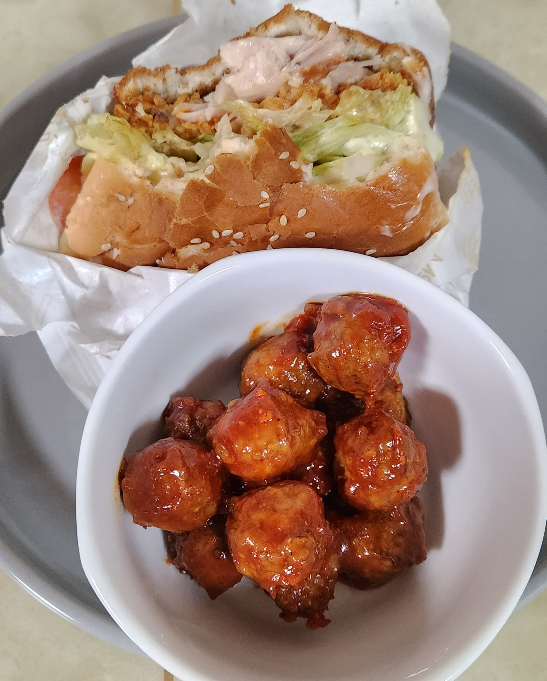 3분 미트볼의 토마토 베이스 소스와 맘스터치 버거의 기본 마요네즈 소스가 함께 잘 어우러졌다.