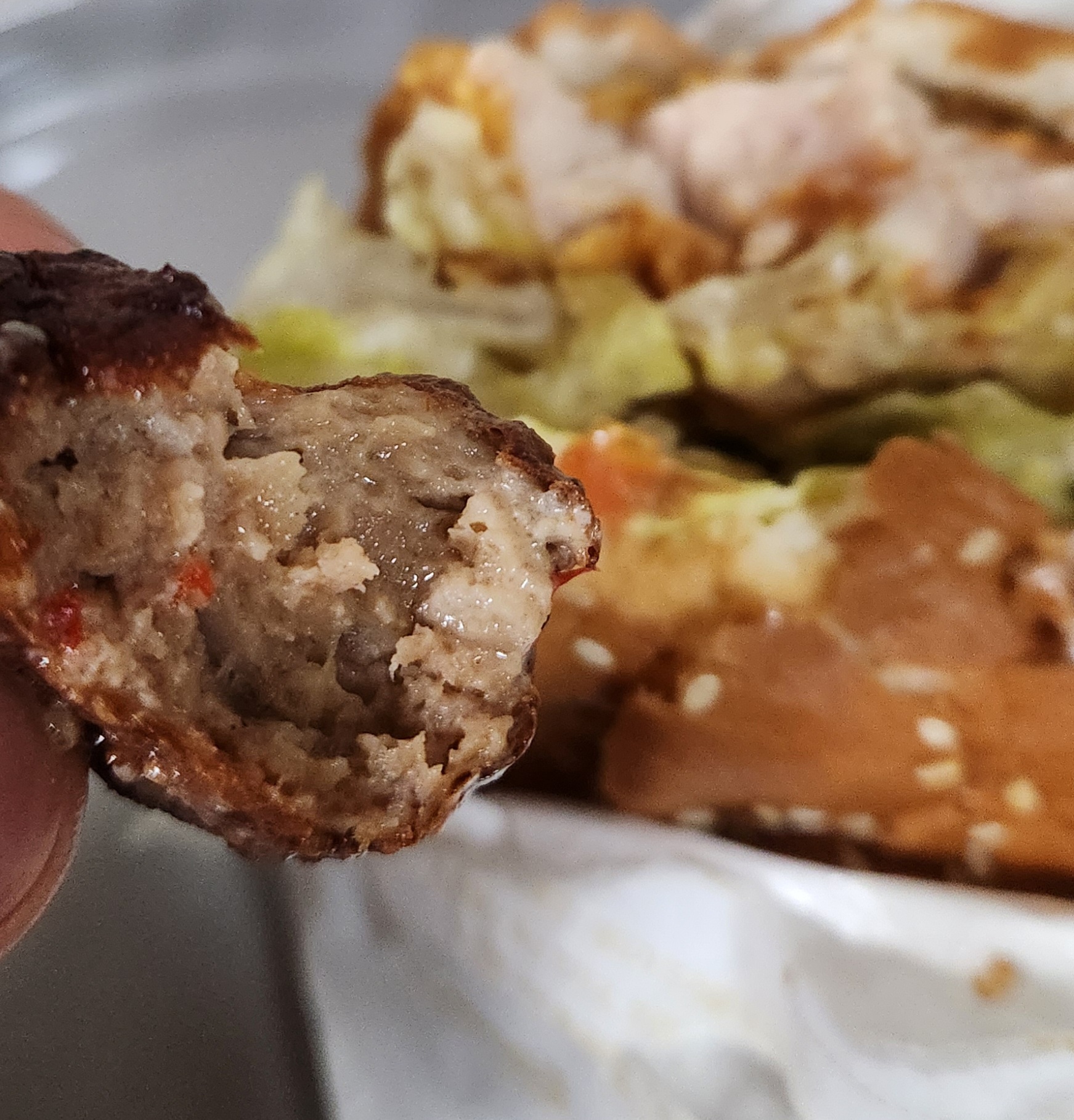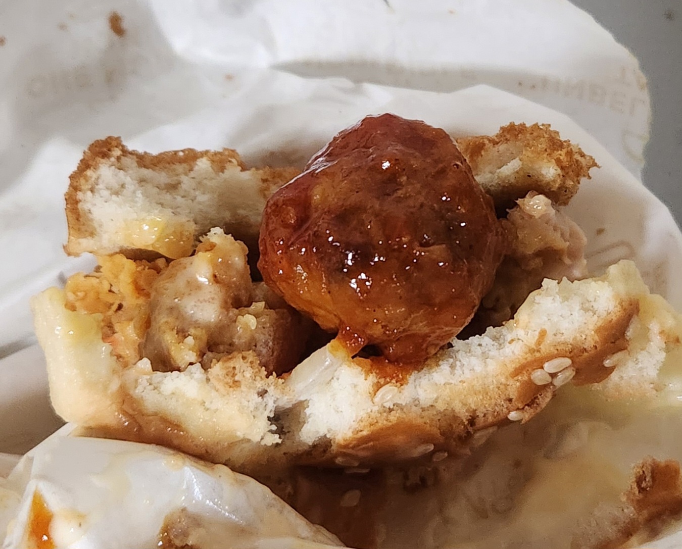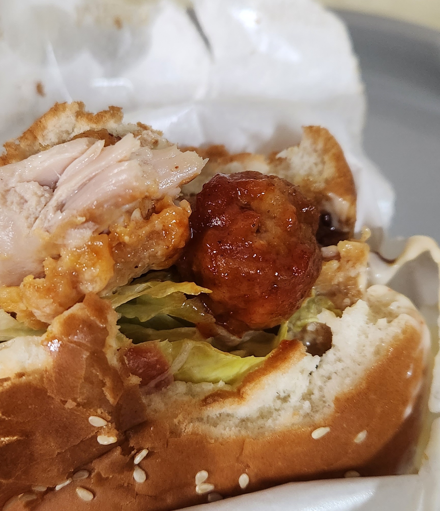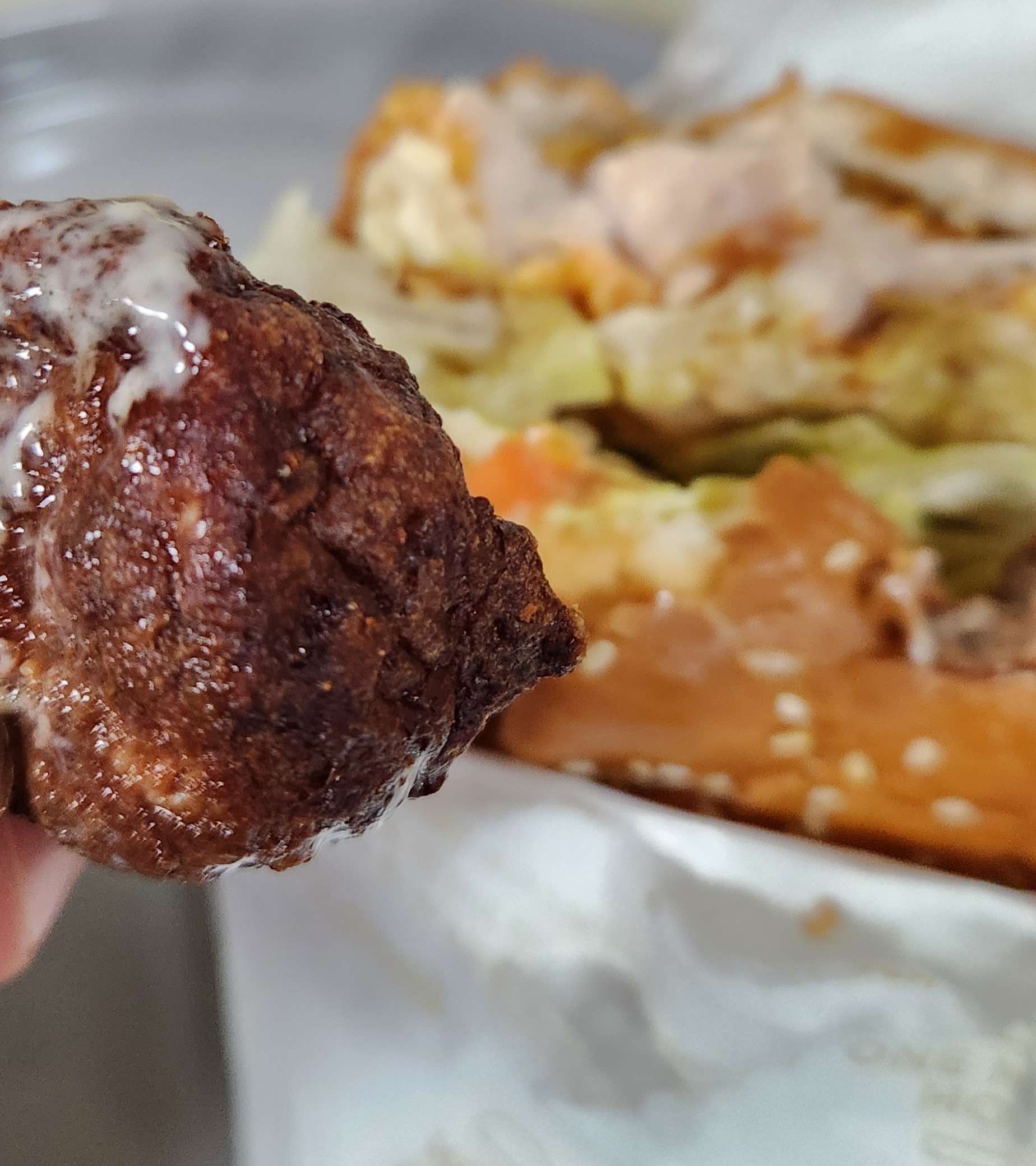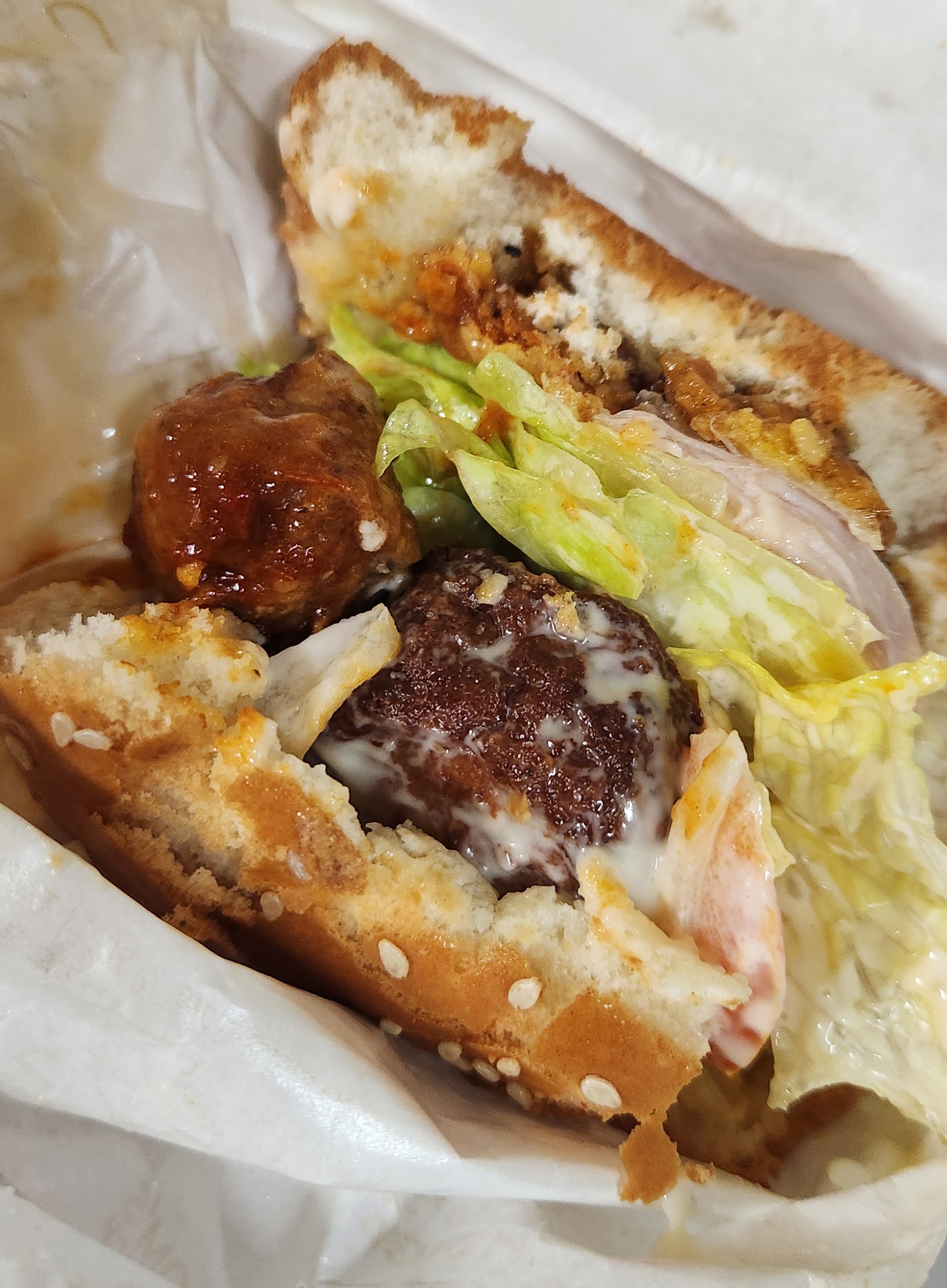 버거 속 마지막 미트볼이 보이자 3분 미트볼을 옆에 나란히 놓고 먹어본다.