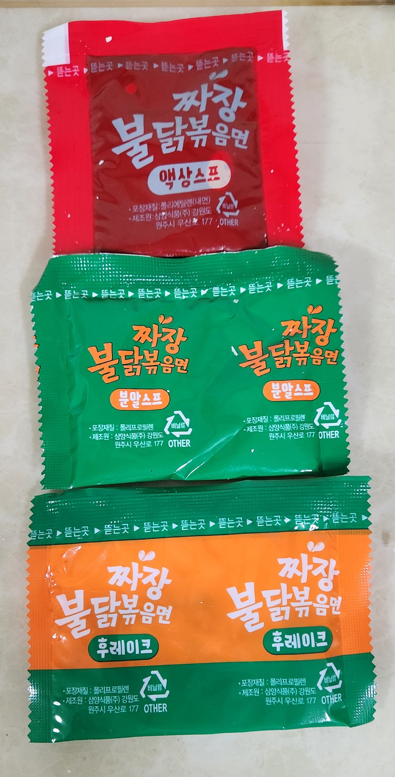 후레이크와 매운 맛을 내는 액상스프 그리고 짜장분말스프 이렇게 3가지의 스프가 들어있다.