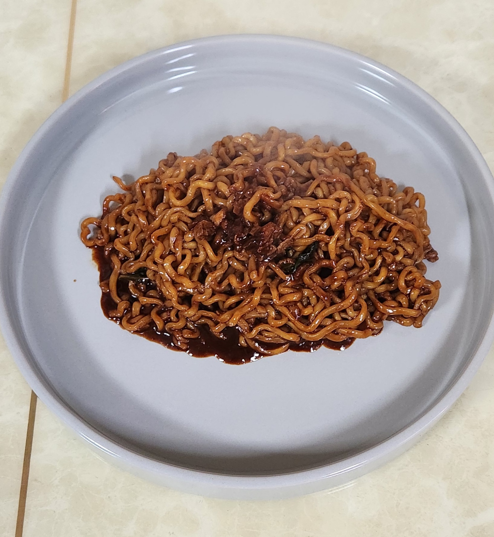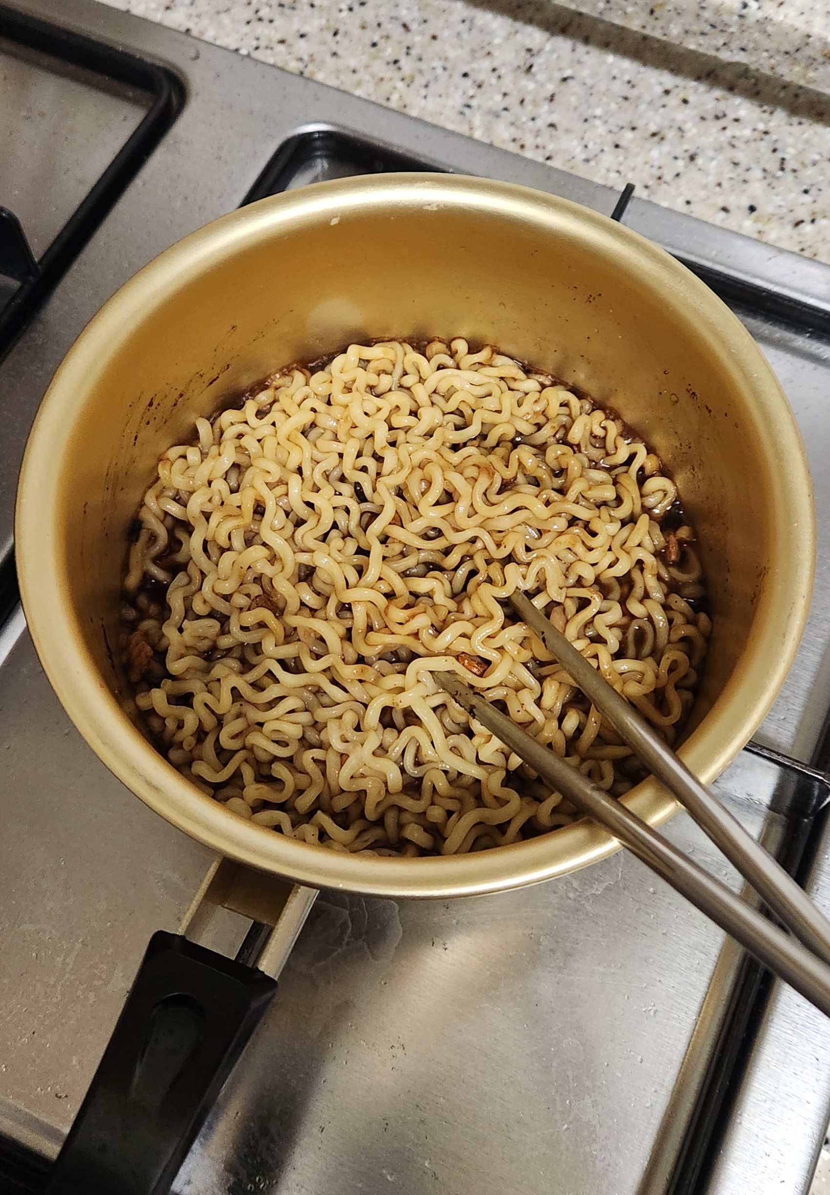 면이 다 익어갈 때 즈음 물을 거의 다 버리고 짜장분말스프와 후레이크만 넣고 잘 섞는다.