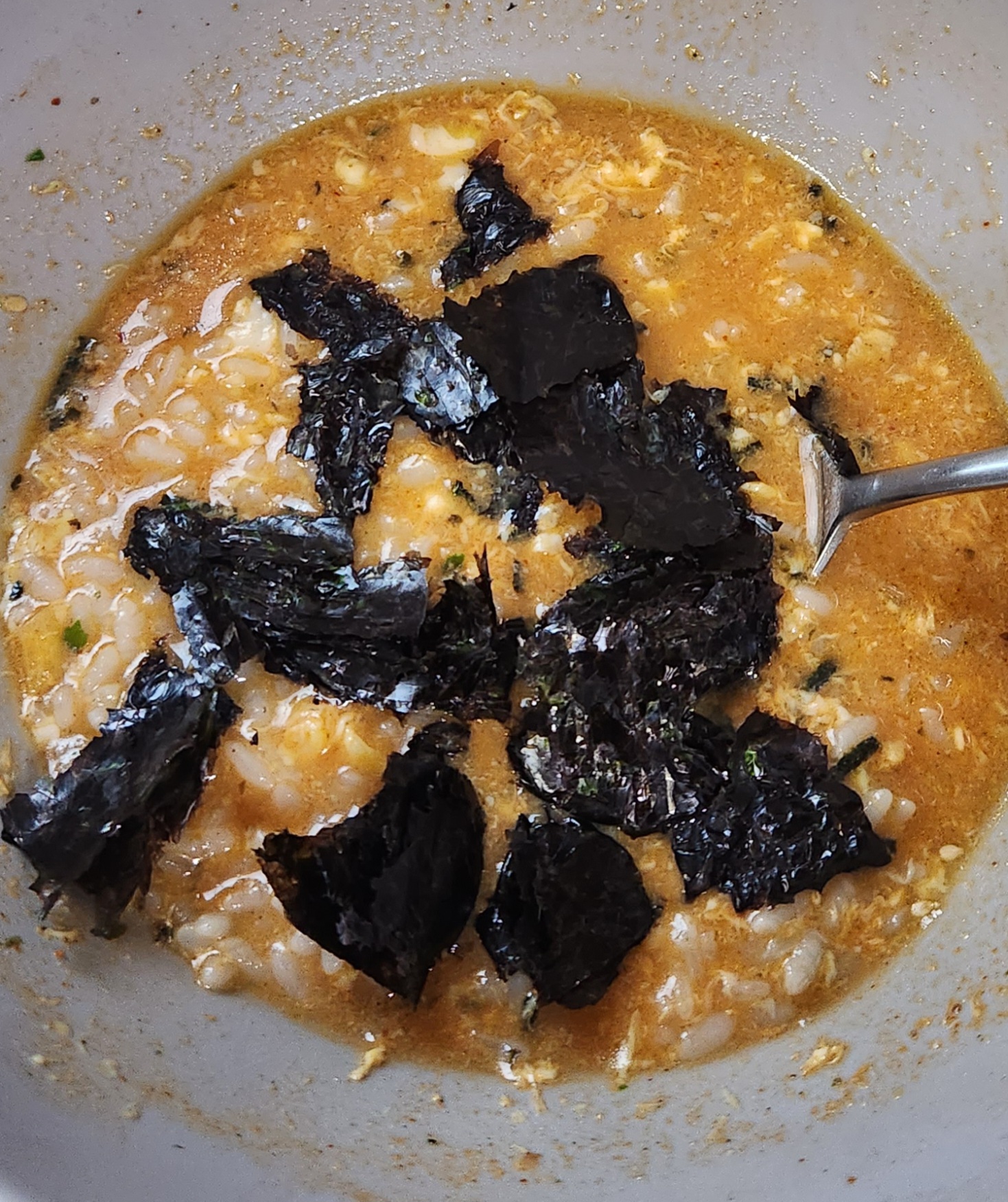 스프에 김이랑 깨가 들어갔으니 고소한 느낌의 라면일 것이라 예상해 본다.