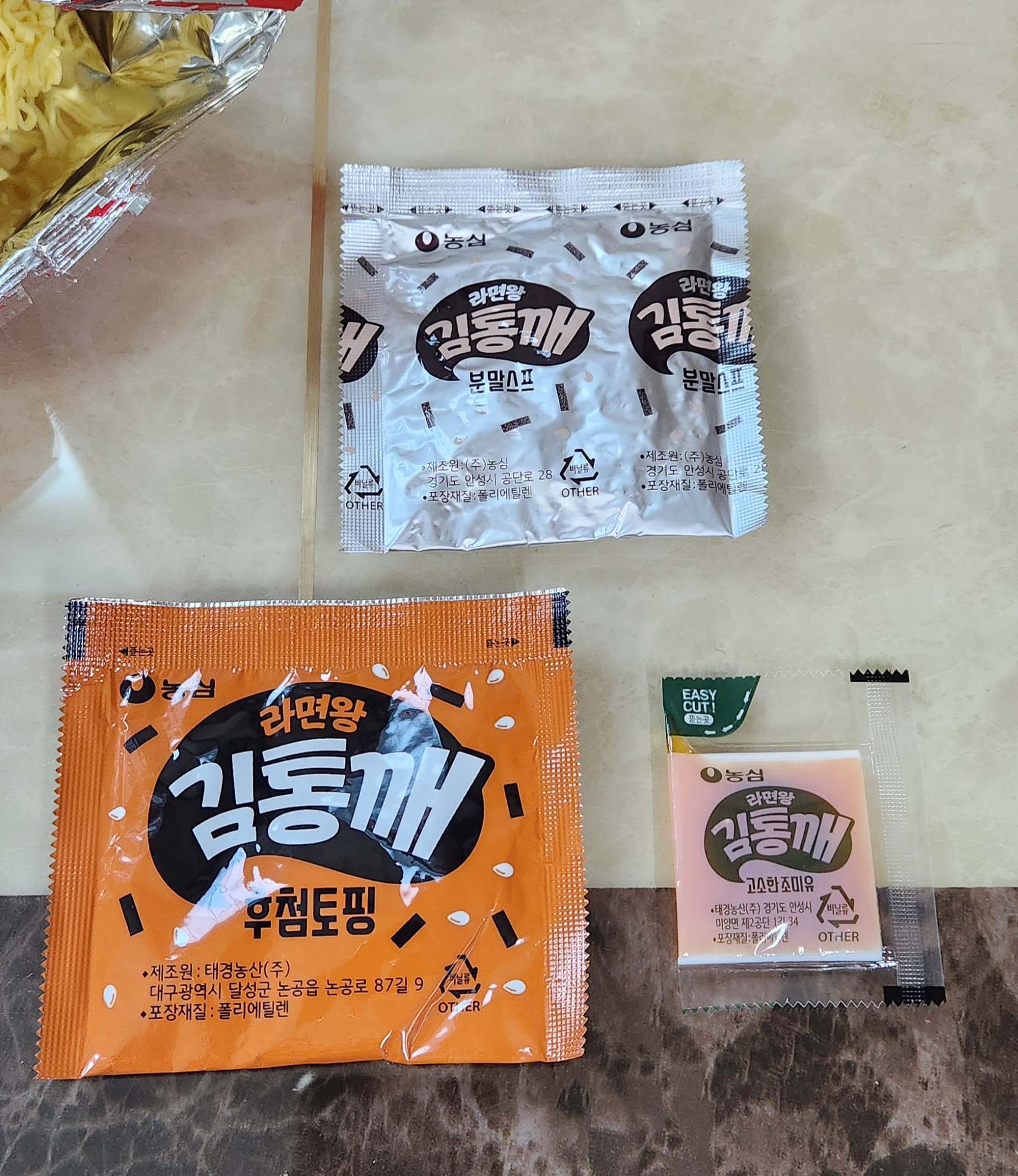 스프는 기본 분말스프, 김과 깨가 들어있는 후첨토핑, 그리고 조미유 이렇게 3가지가 있다.