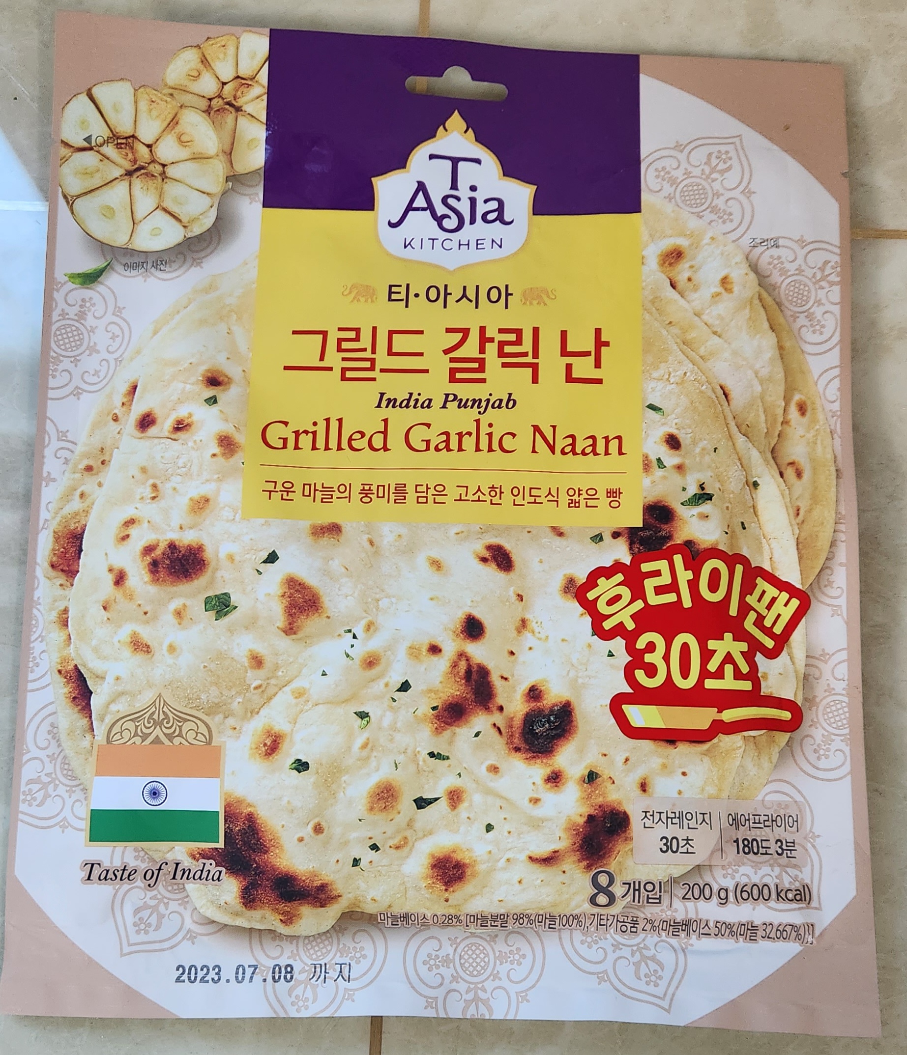 20여 년 전에 인도로 배낭여행을 가서 낯선 음식에 초반 적응을 못 했는데 내 입맛에 유일하게 맞았던 인도 음식이 요거트 음료인 라씨와 난 중에서도 갈릭난이었다. 그 후 한국에 있는 인도 레스토랑에서 한두 번 갈릭난을 먹어 본 것을 빼면 한동안 생각도 나지 않았는데 이렇게 우연히 보니 오래 연락이 끊긴 친구들 길에서 마주친 것처럼 반가웠다.