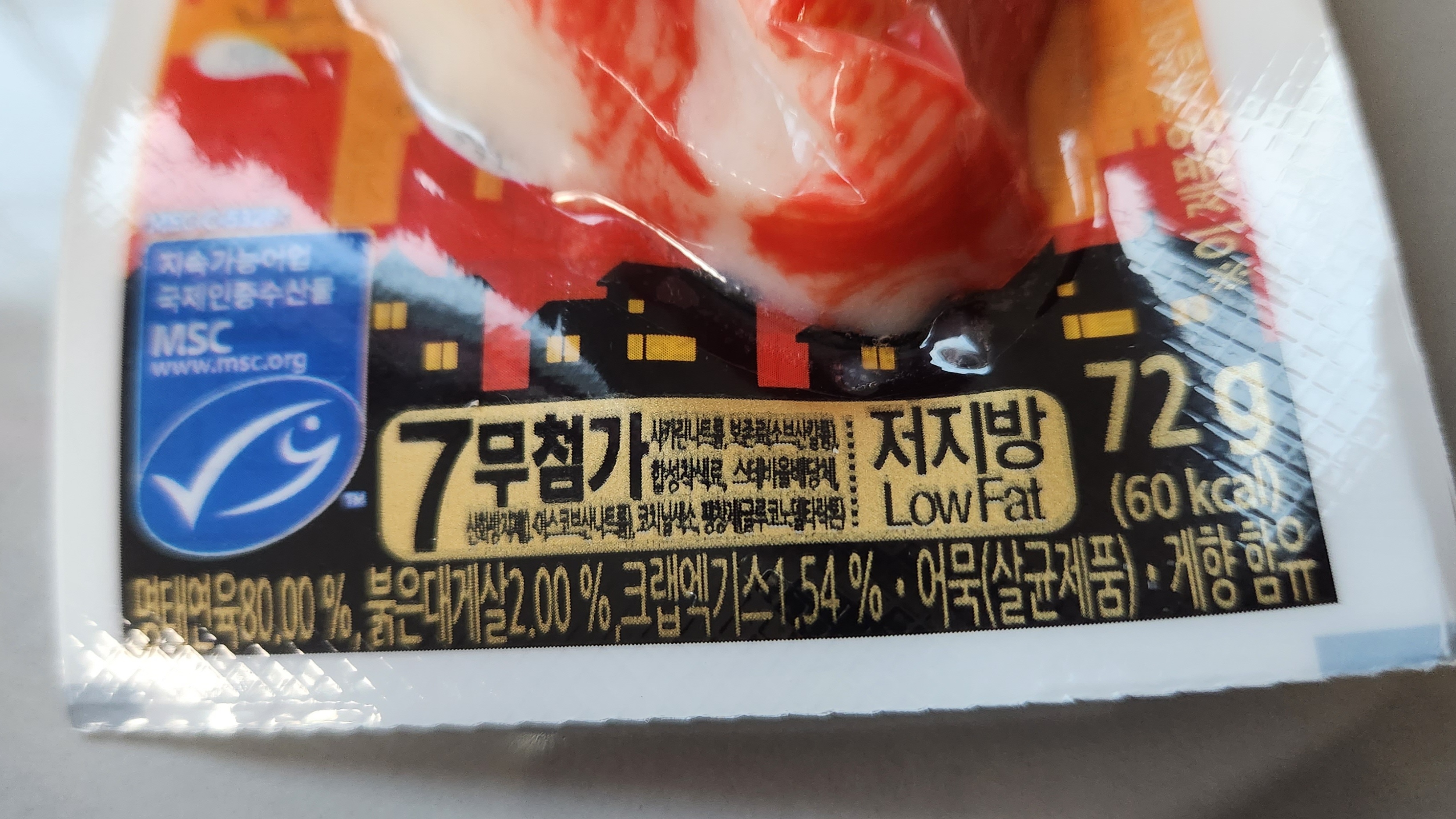 게맛살의 주재료인 명태 연육이 80%가 들어가 있다.
