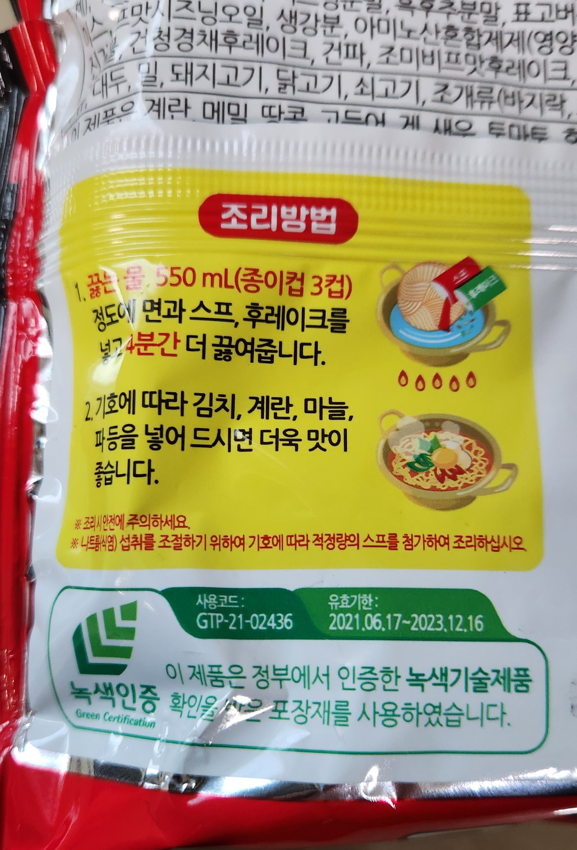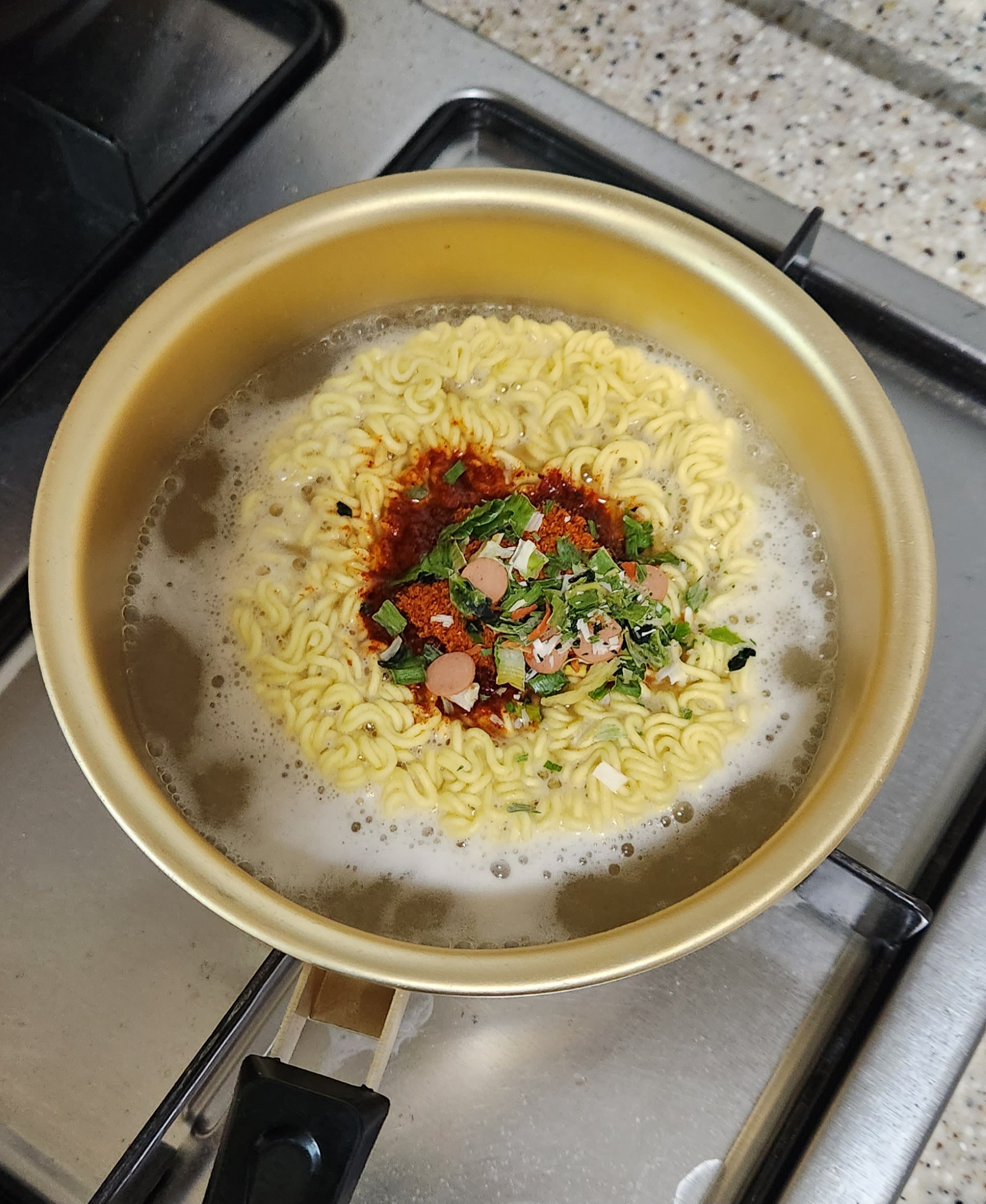레시피대로 물 양을 550ml 하려다 국물을 적게 해서 먹는 걸 고려해 500ml만 넣고 라면을 끓인다.