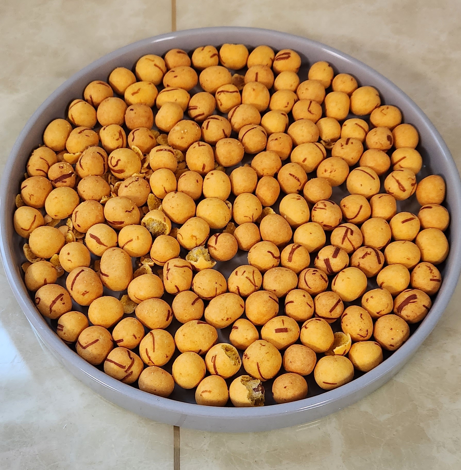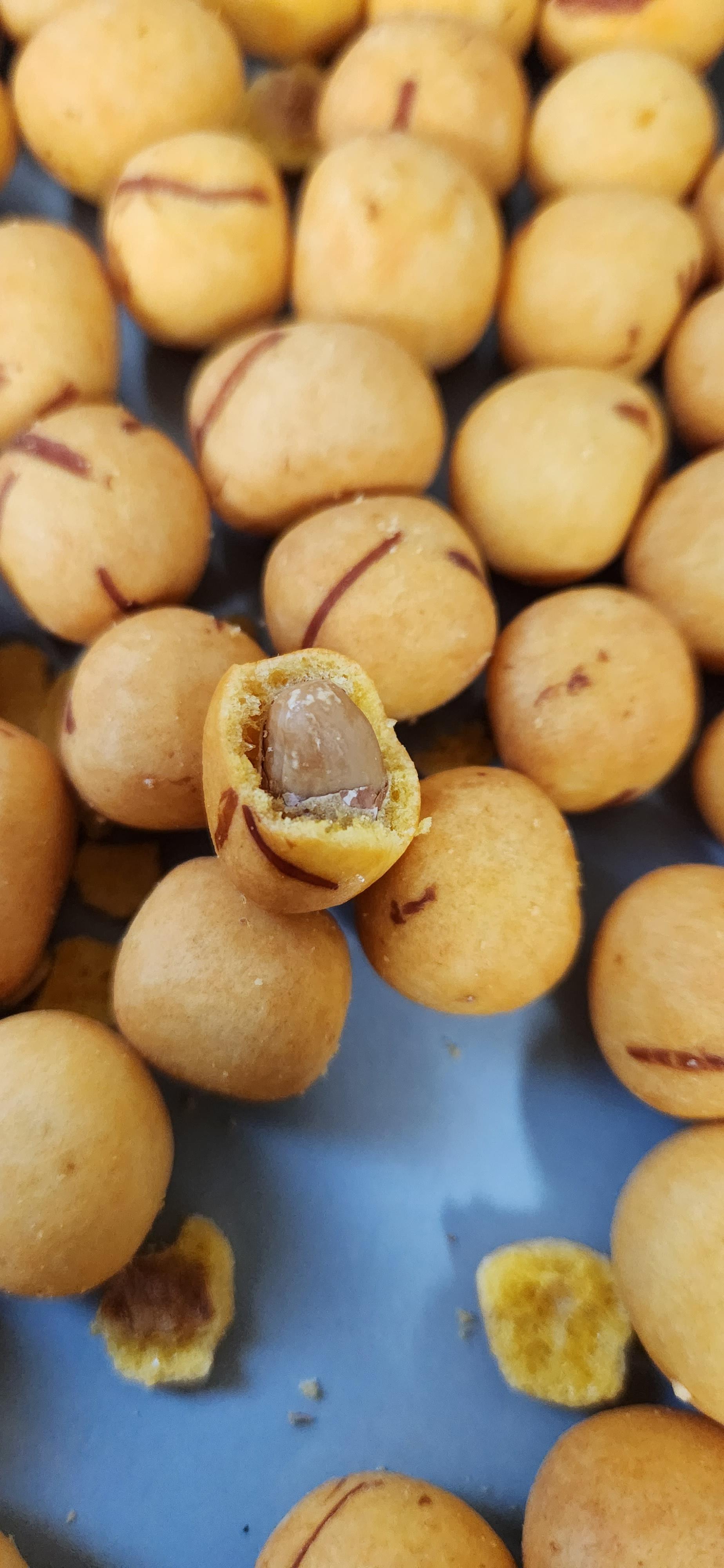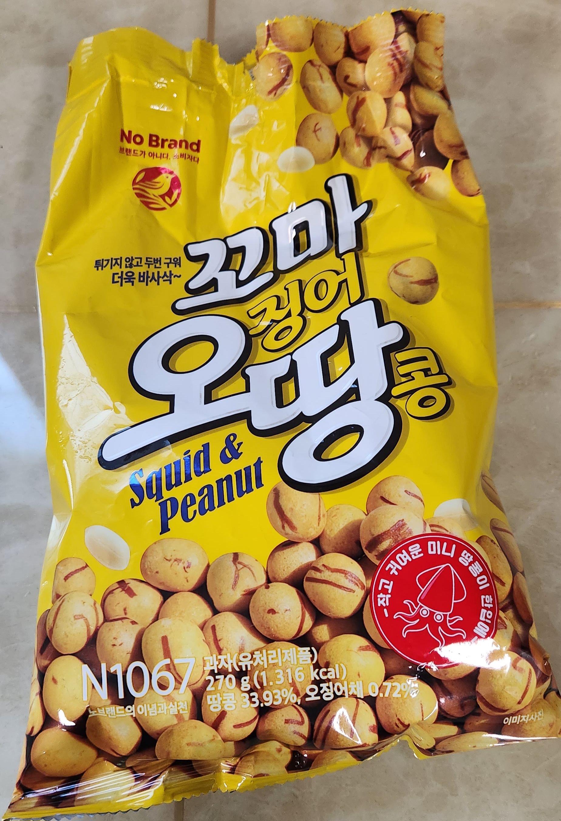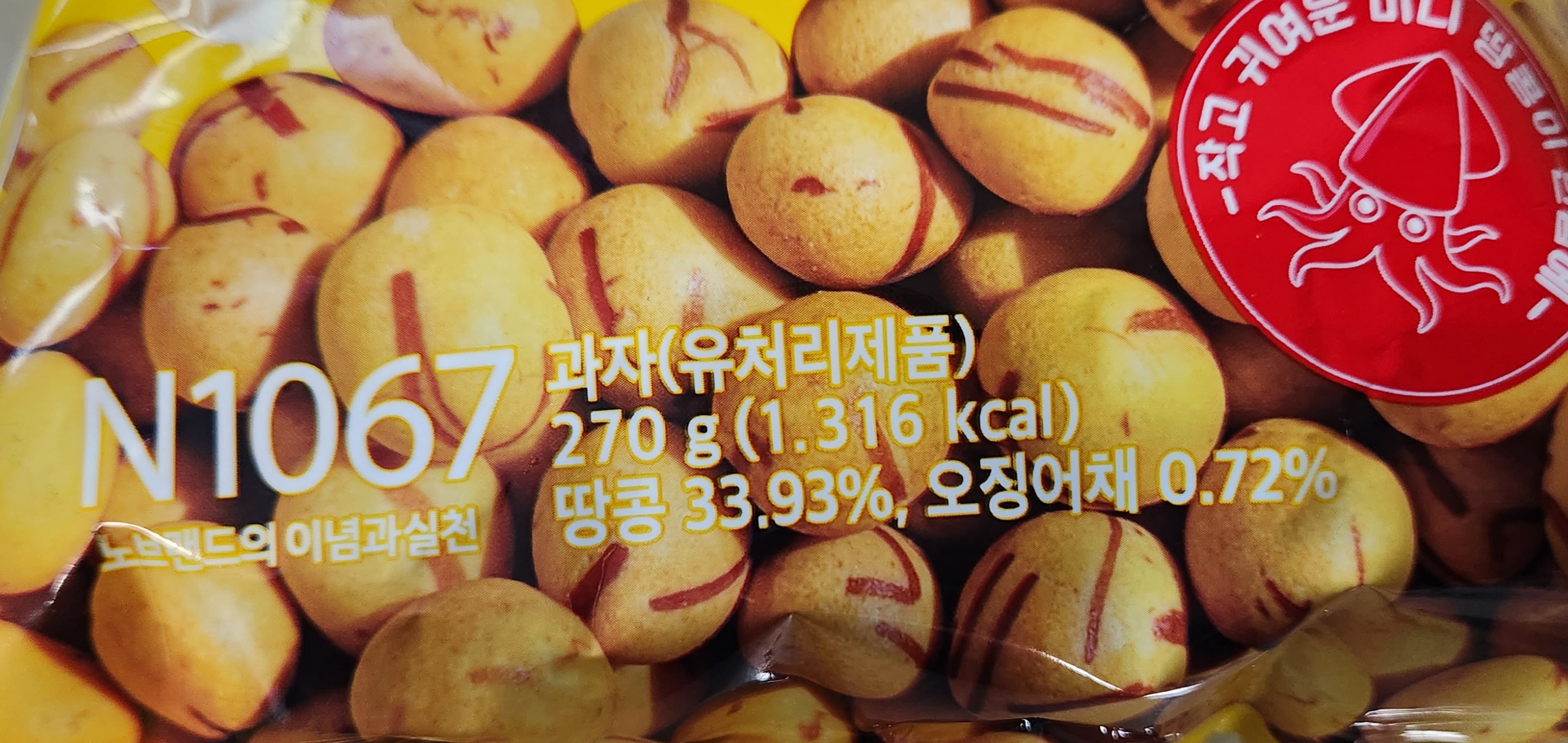 오리온 오징어땅콩은 겉에 과자와 땅콩 사이에 공간(?)이 있는데 노브랜드 오징어땅콩은 사진에서처럼 중간에 공간이 없이 땅콩을 과자가 감싸고 있다.