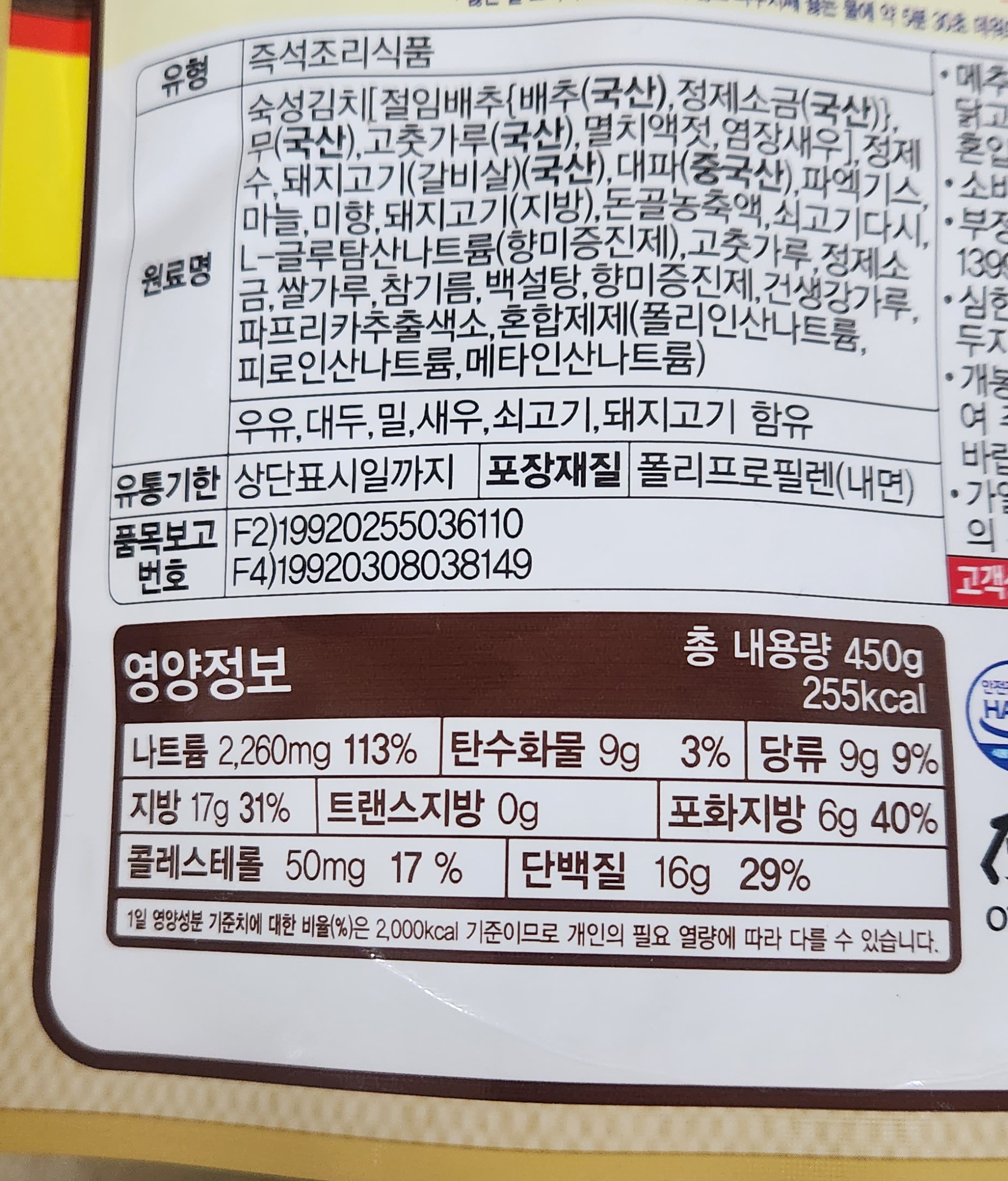 뒷면에 있는 자세한 영양정보와 원료 정보.