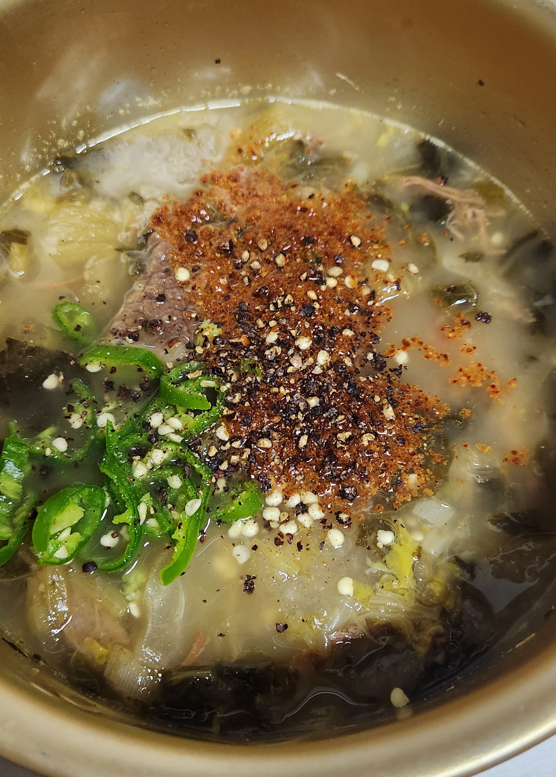 얼갈이배추, 쇠갈비, 양지가 건더기로 들어 있다고 표시되어 있다.