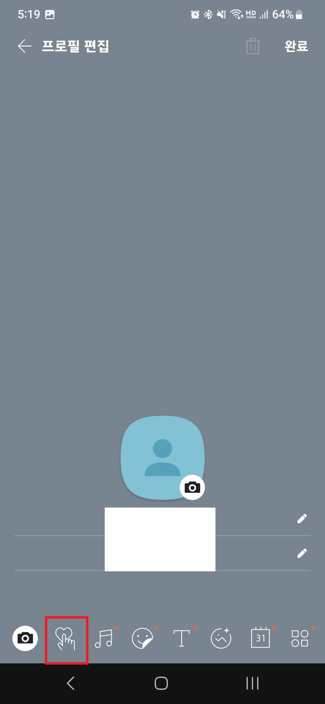 프로필 편집 화면 하단 좌측에 하트를 손가락이 누르고 있는 아이콘을 클릭!