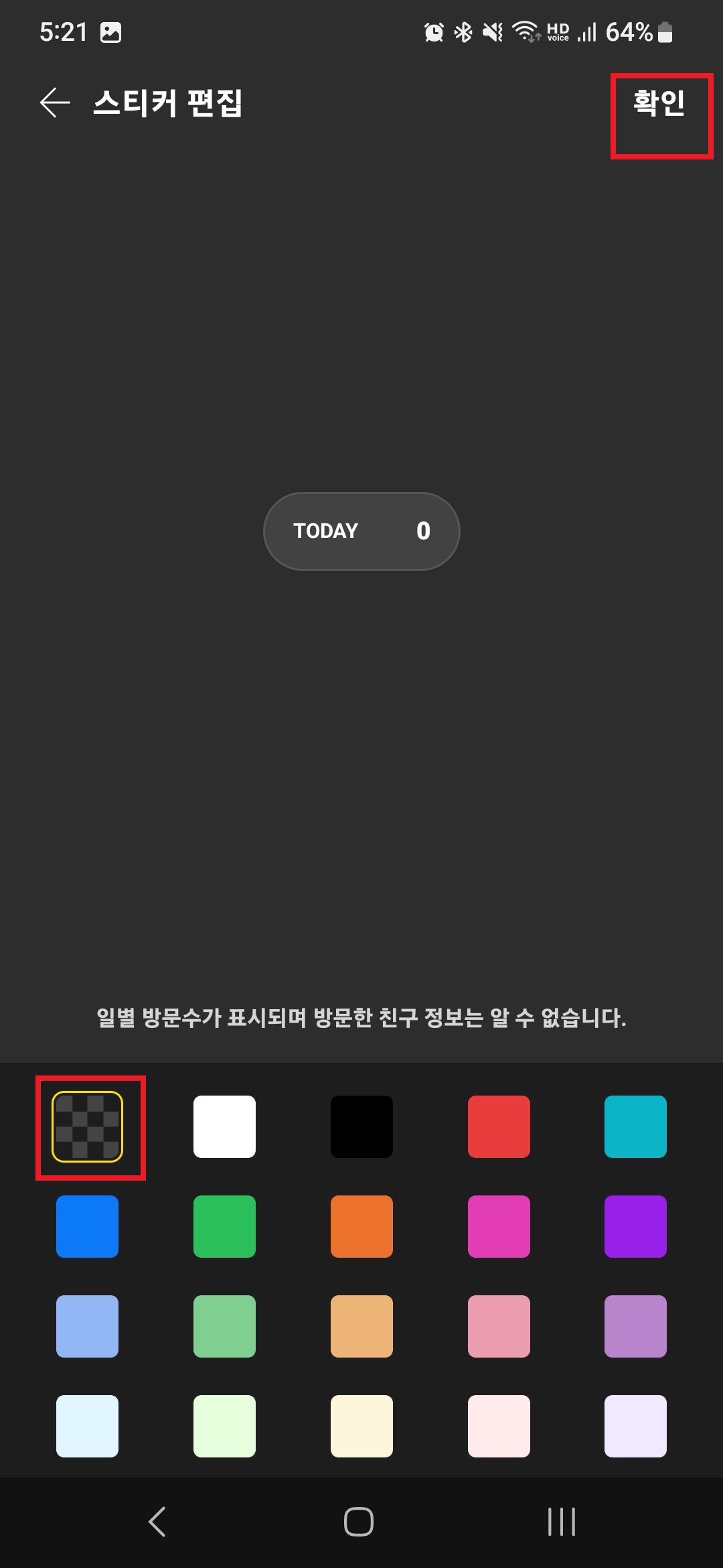 원하는 스티커의 색상을 선택하고 우측 상단에 '확인' 버튼을 누르면,