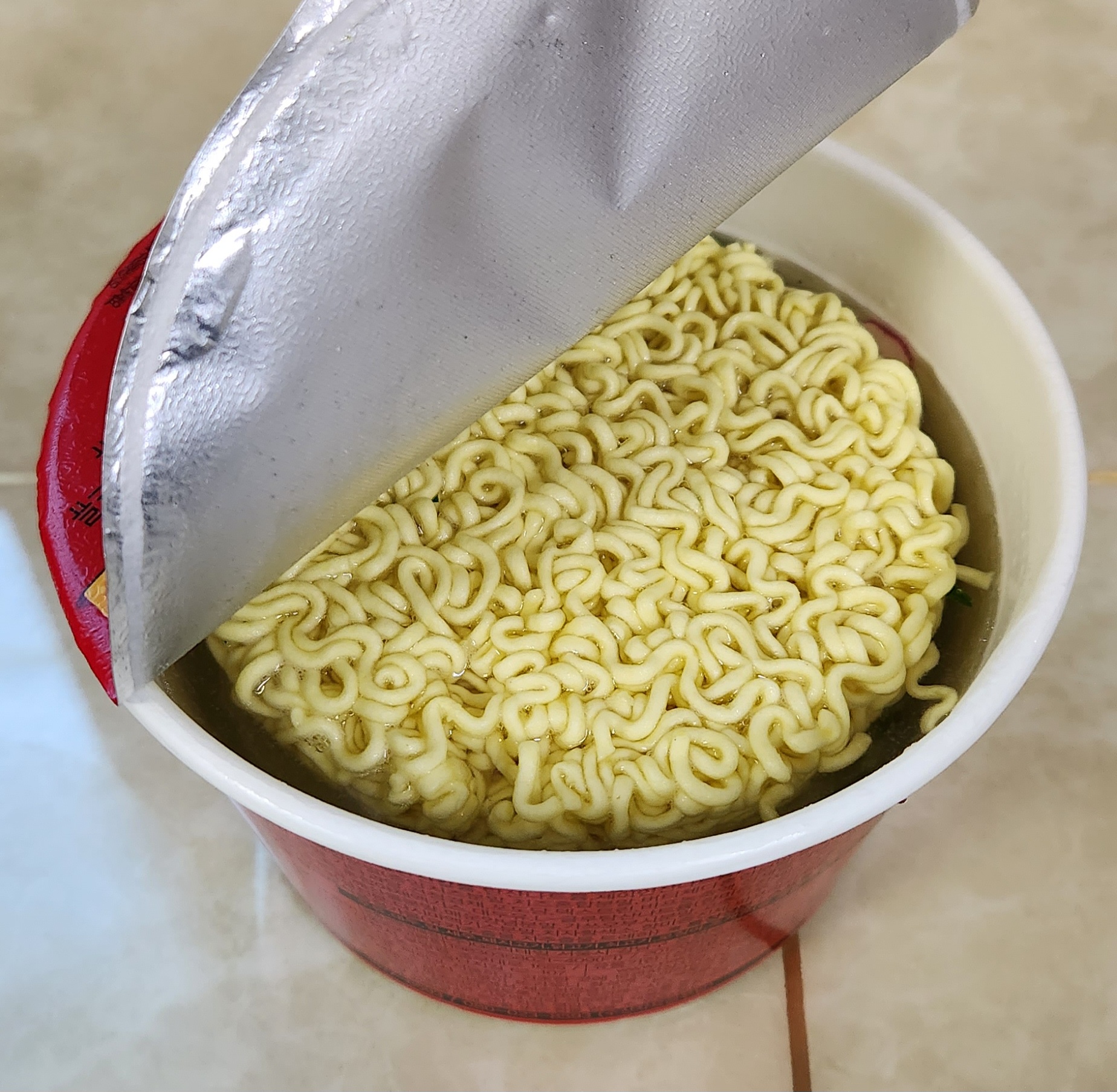 볶음면이라 건더기를 흘리지 않고 물을 따라낼 수 있는 구멍이 있다.