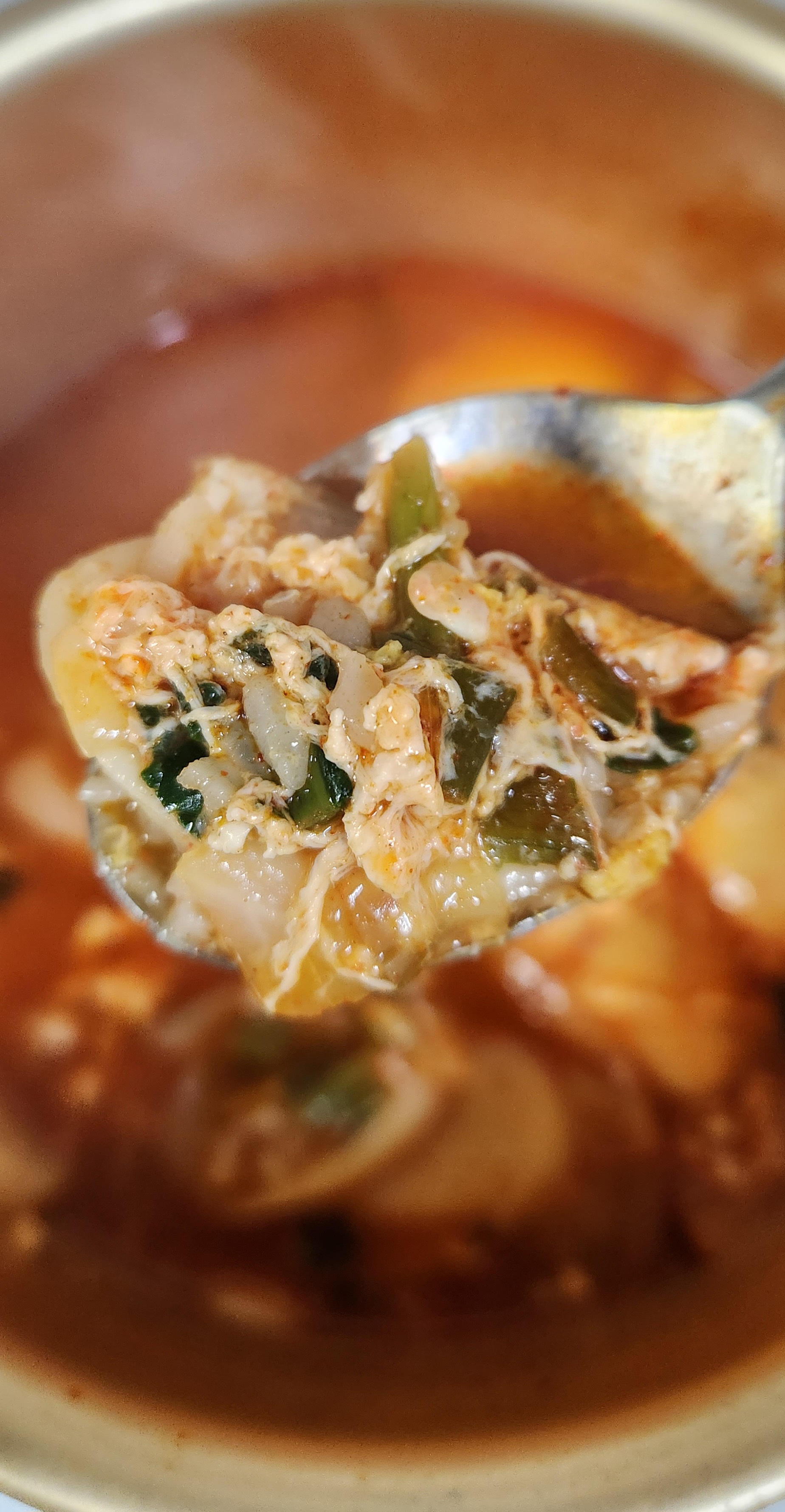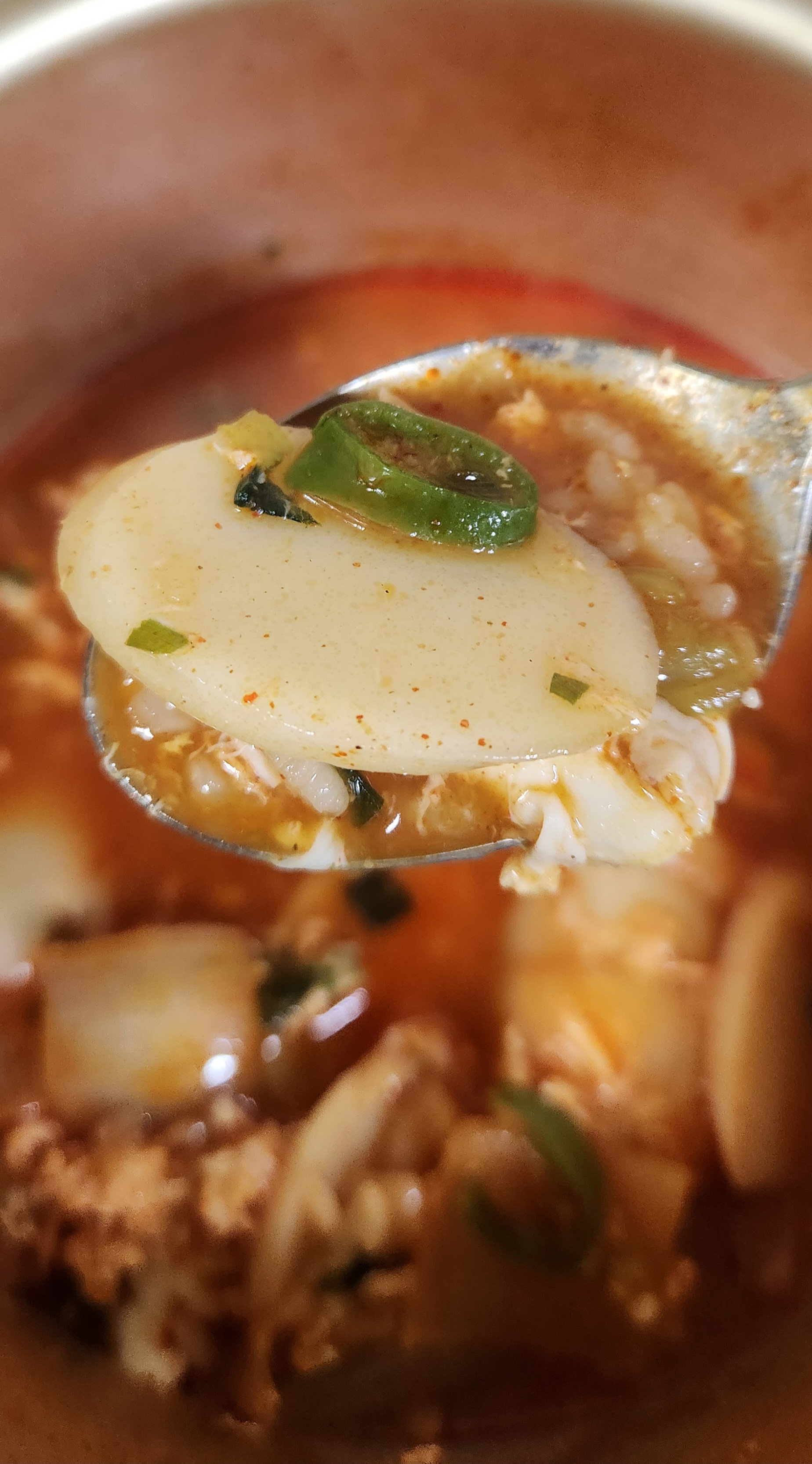 수저에 국물을 최대한 걸러서 떡, 밥, 달걀, 청양고추 등의