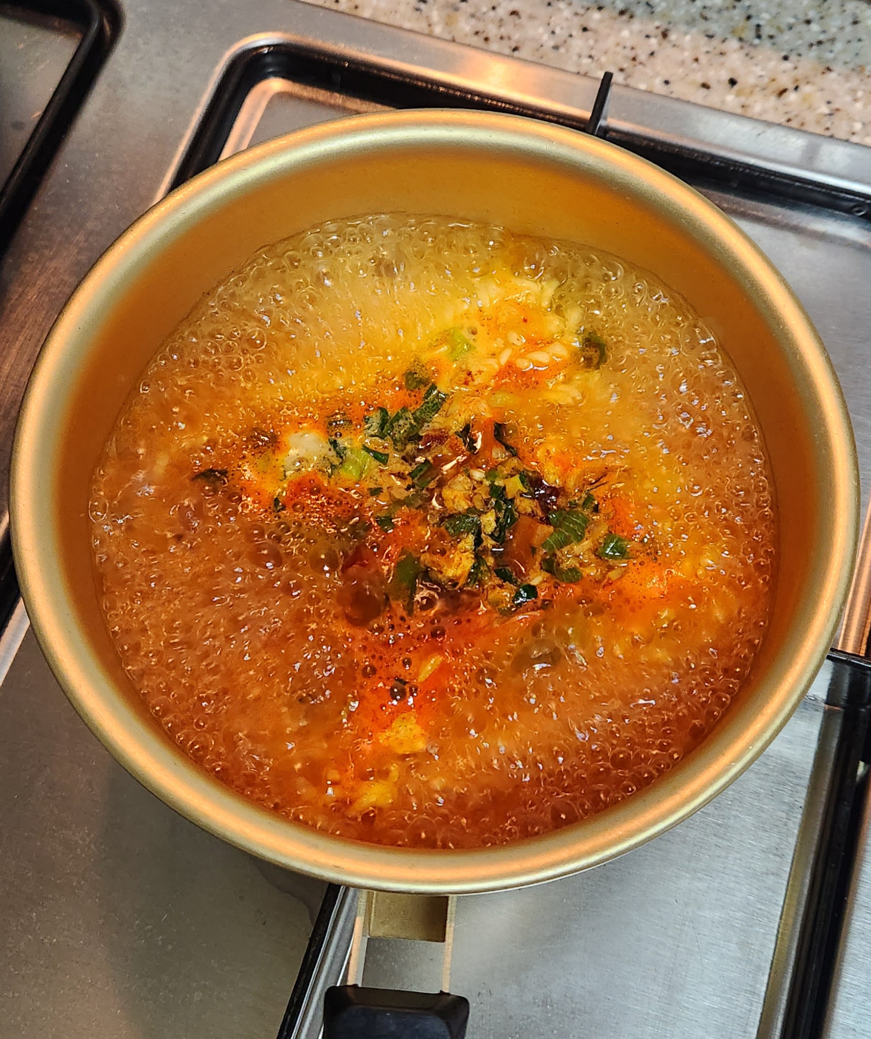 면을 다 먹고 국물에 밥과 떡, (비교적 하나도 안 매운) 청양고추,