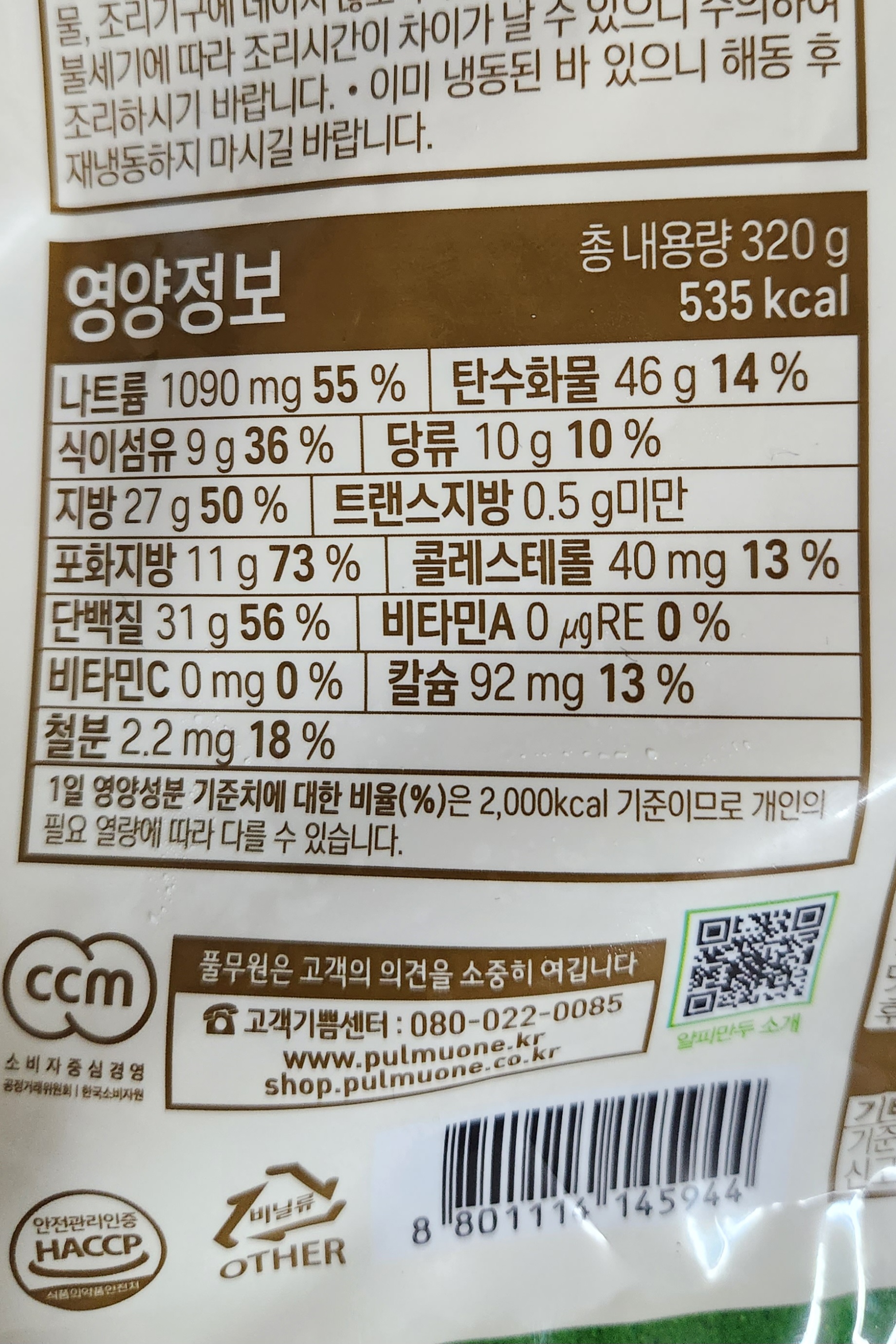 내용량은 320g, 한 봉지 총 칼로리는 535kcal.