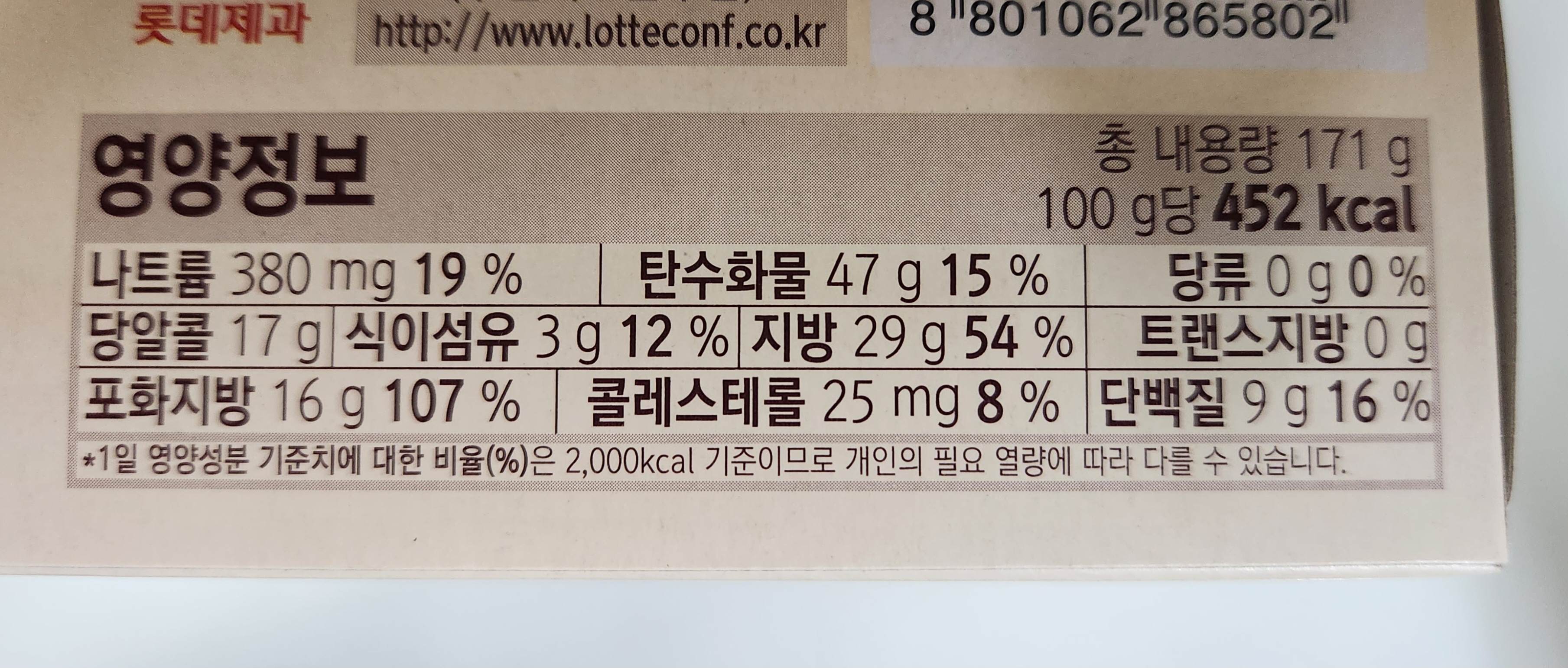 총 내용량은 171g이고 100g 칼로리는 452kcal이니