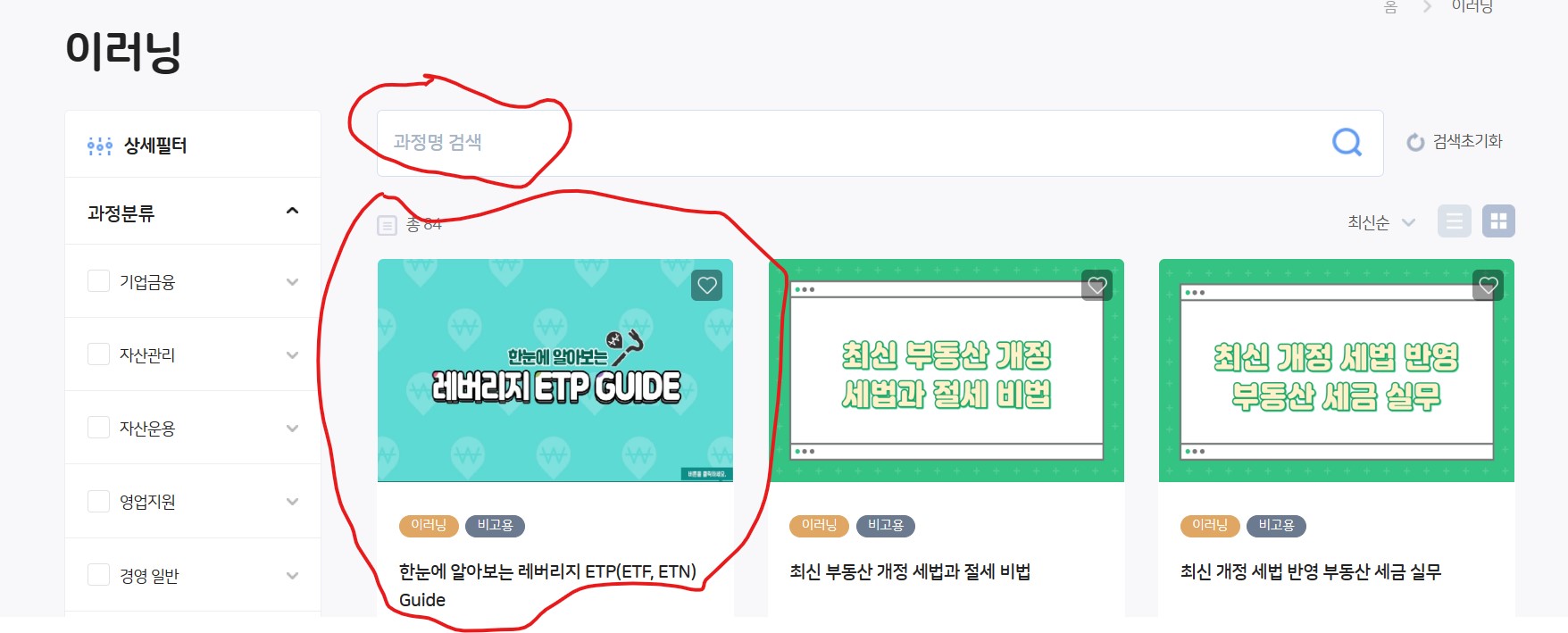 4. 나 같은 경우에는 이러닝 메뉴를 클릭하자마자 보다시피 첫 화면 가장 첫 번째에 해당 과정인 '한눈에 알아보는 레버리지 ETP(ETF, ETN) Guide'가 떠서 특별히 검색할 필요가 없었다.