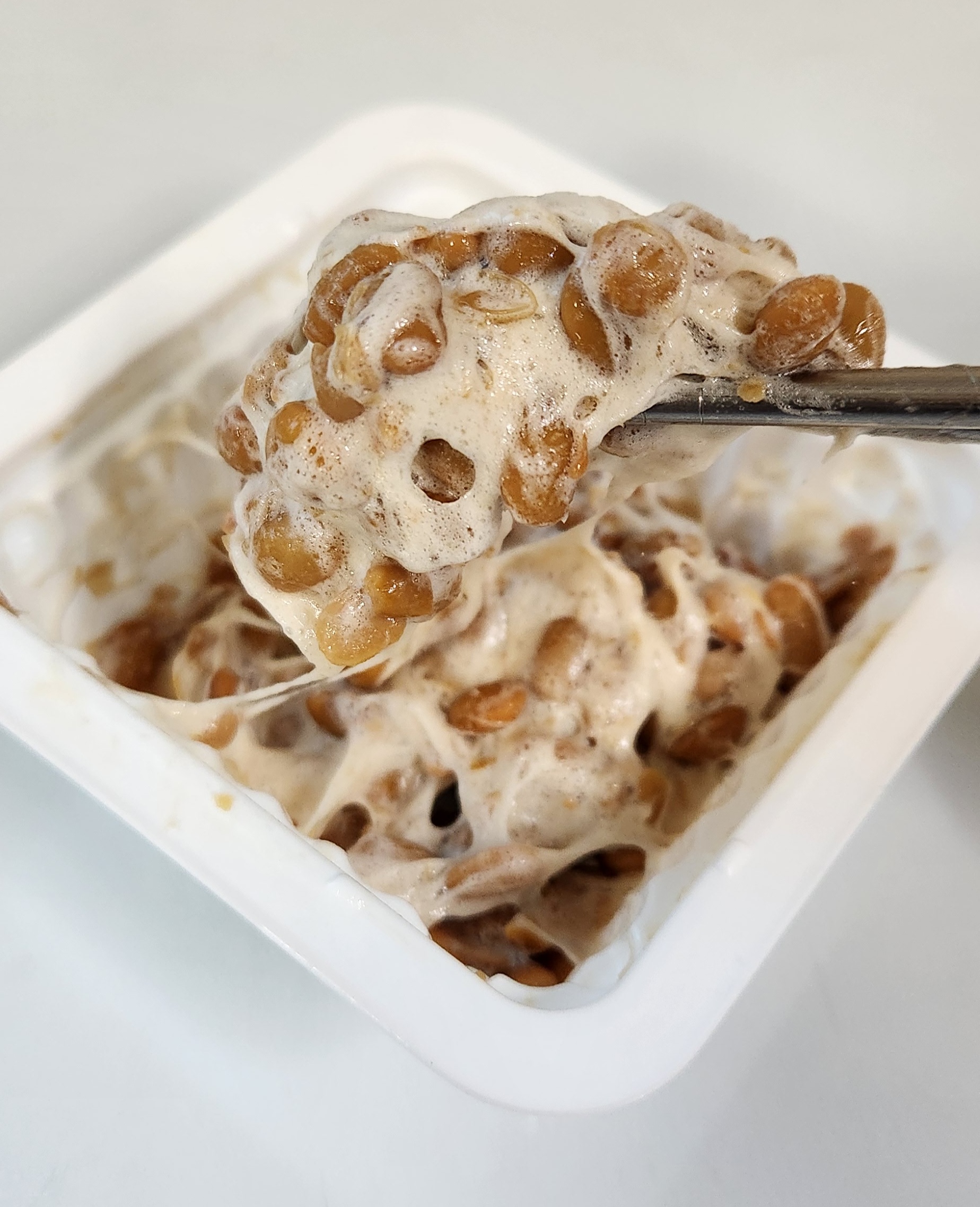감칠맛 이외에도 휘젓는 동작을 통해 낫또의 식감도 좋아진다고 합니다. 일단 낫또는 콩(soy bean)을 발표시켜 만드는 음식입니다. 이 발효 과정을 통해 콩의 단백질 성분은 아미노산과 펩타이드 사슬(peptide chains)로 분해됩니다. 이렇게 낫또가 소화에 도움이 되는 식품으로 변신시키기도 하지만 동시에 호불호가 갈리는 맛을 내게 하기도 합니다. 그렇기 때문에 낫또를 휘저음으로써 거품을 생기게 하고 이 거품의 식감이 낫또의 호불호가 갈리는 맛을 상쇄한다고 합니다.