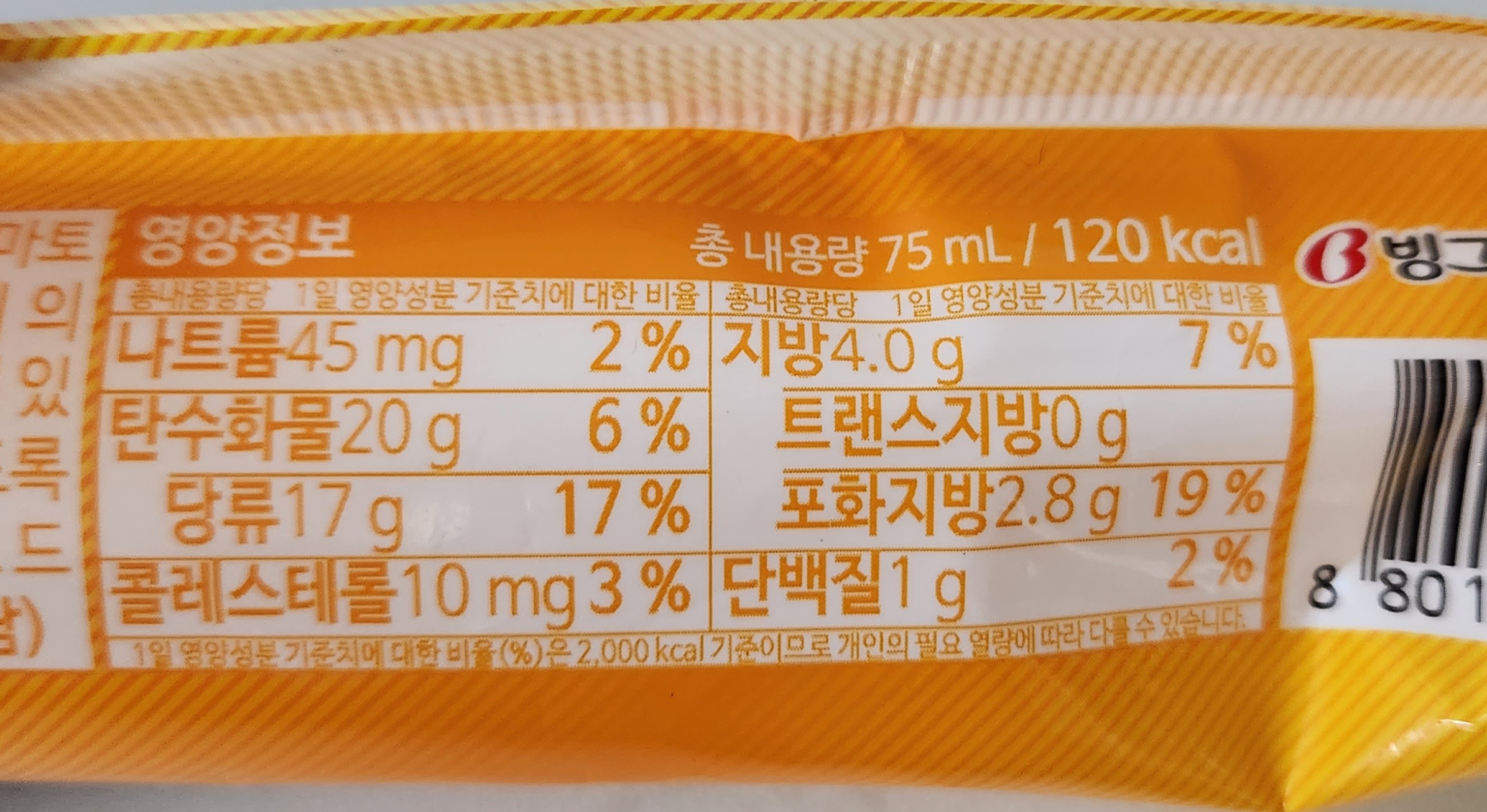 내용량은 75ml, 칼로리는 120kcal.