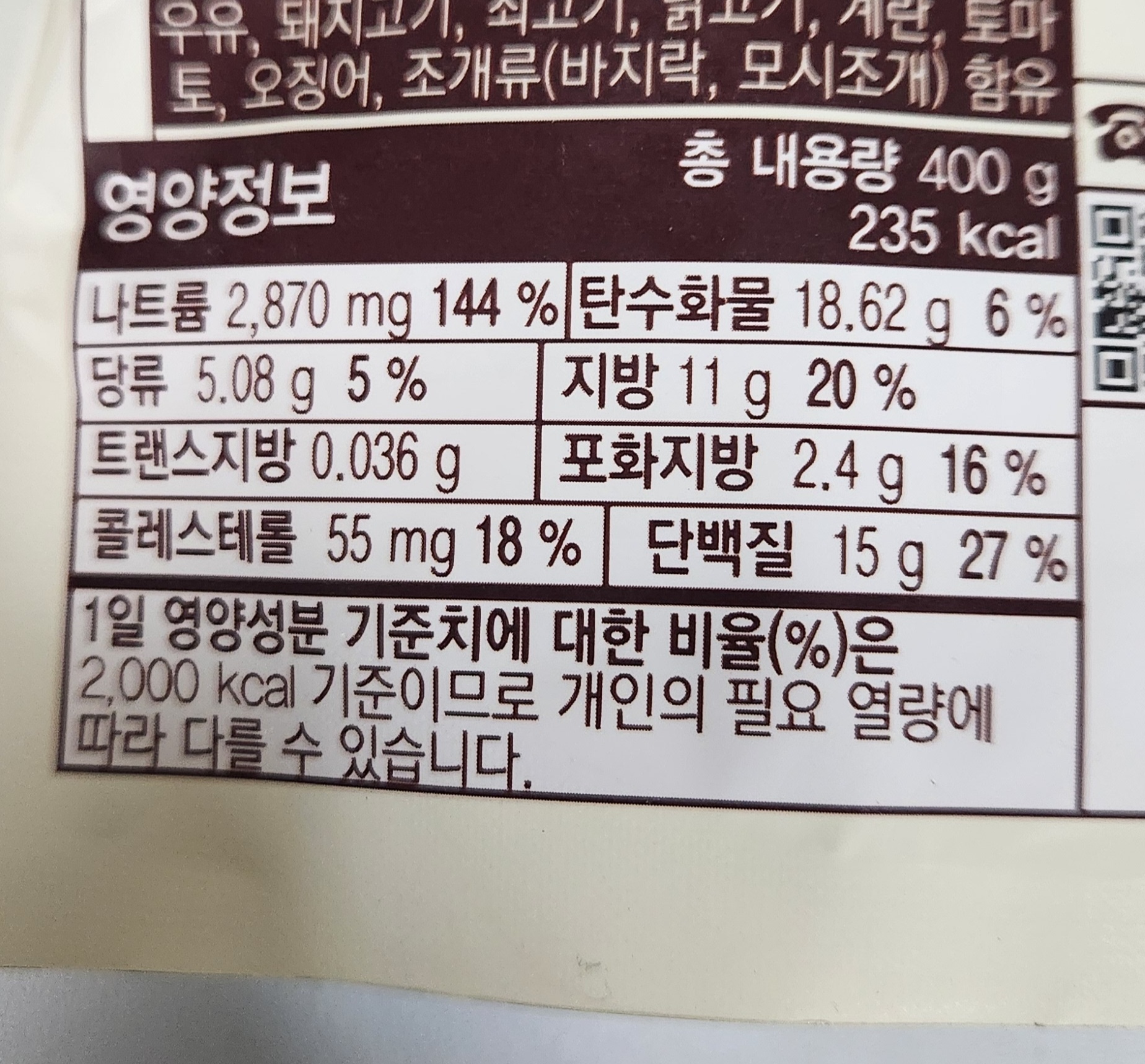 1인분 기준 포장이며 400g에 칼로리는 235kcal.