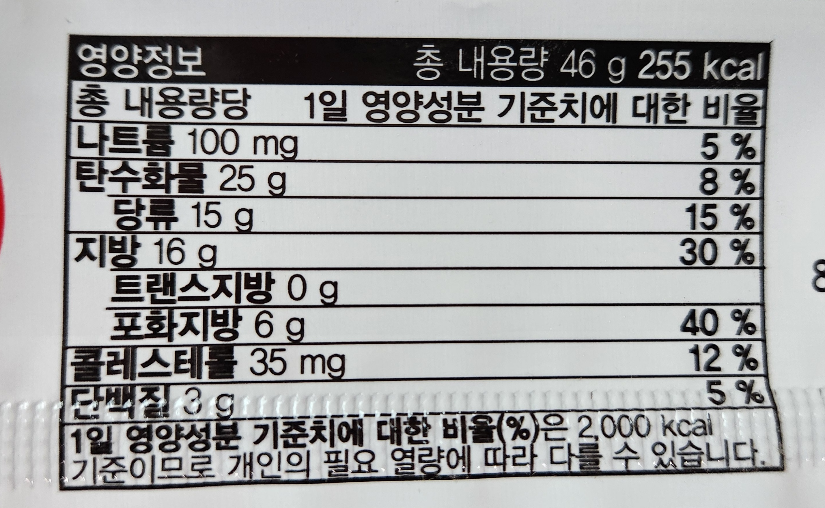 내용량은 46g에, 칼로리는 255kcal.