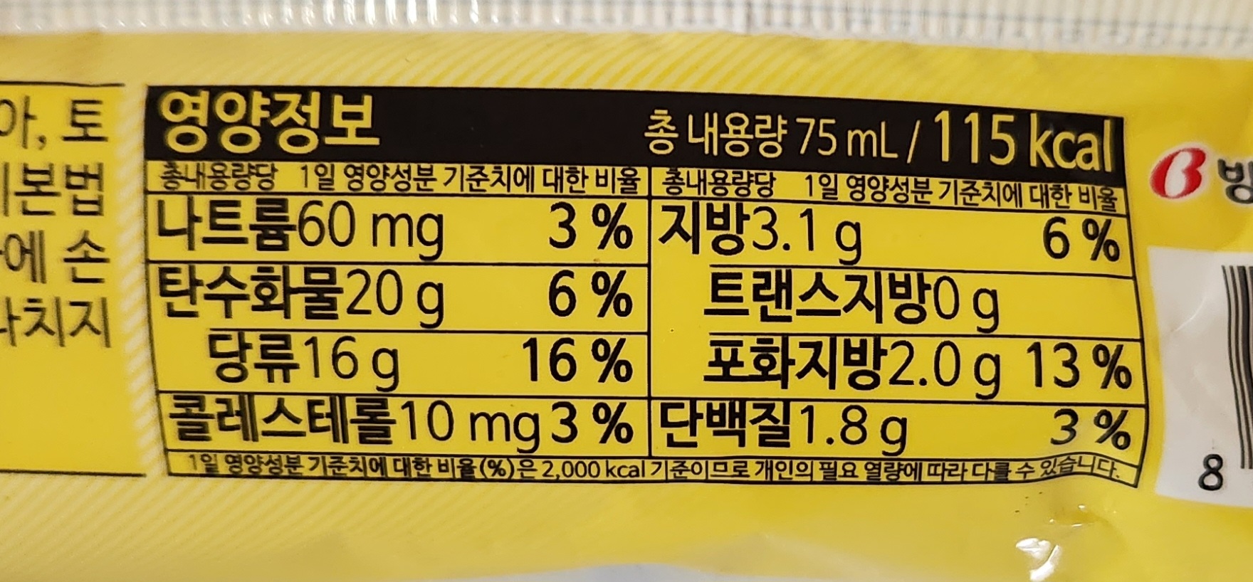 총 내용량 75mL에 칼로리는 115kcal.