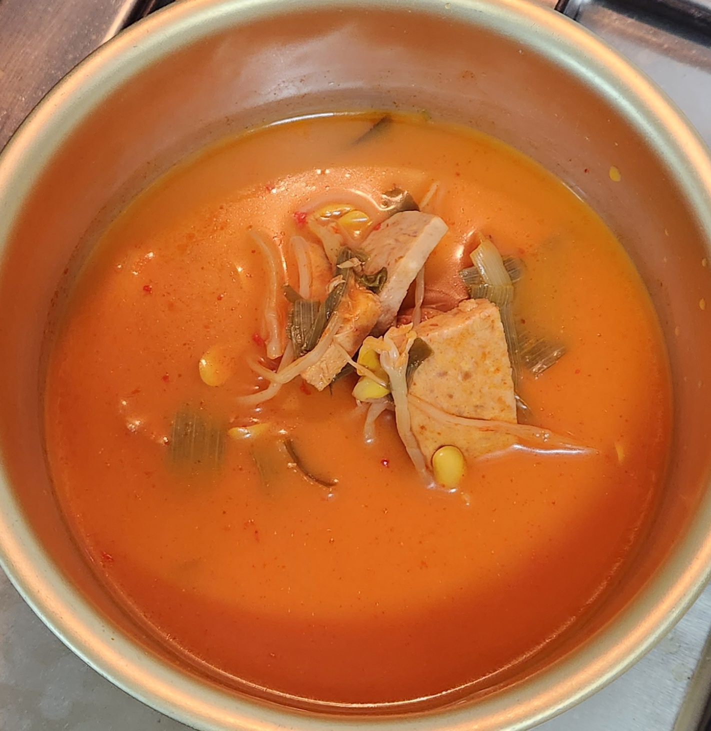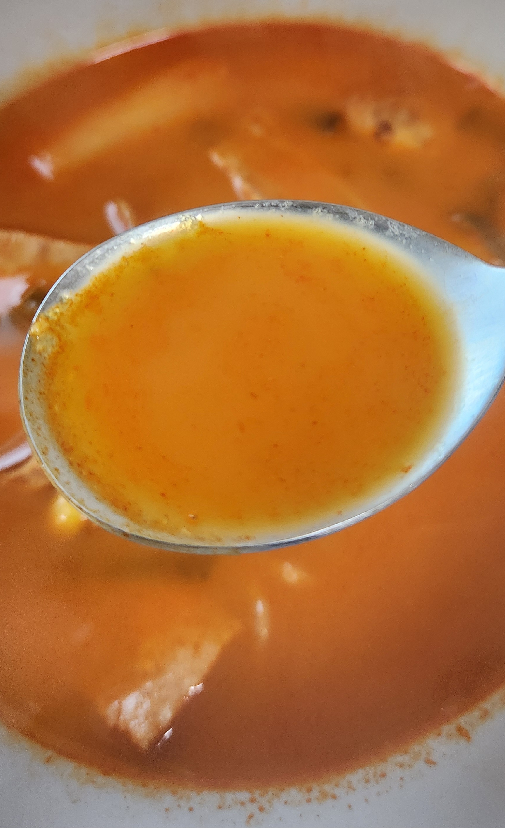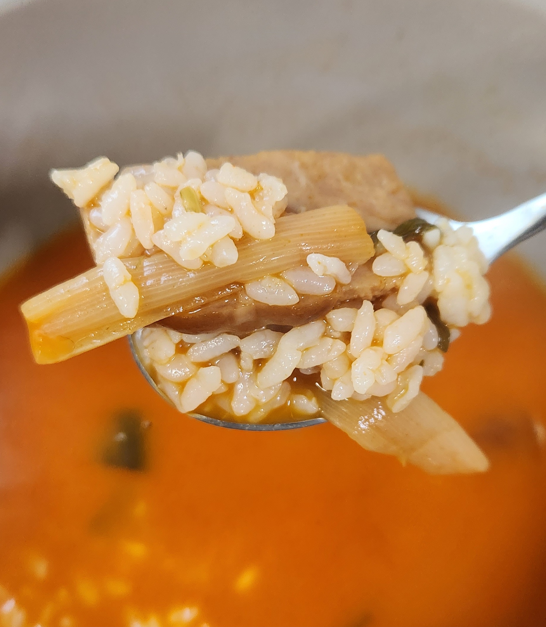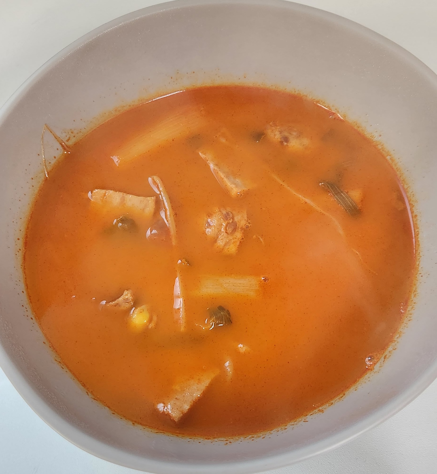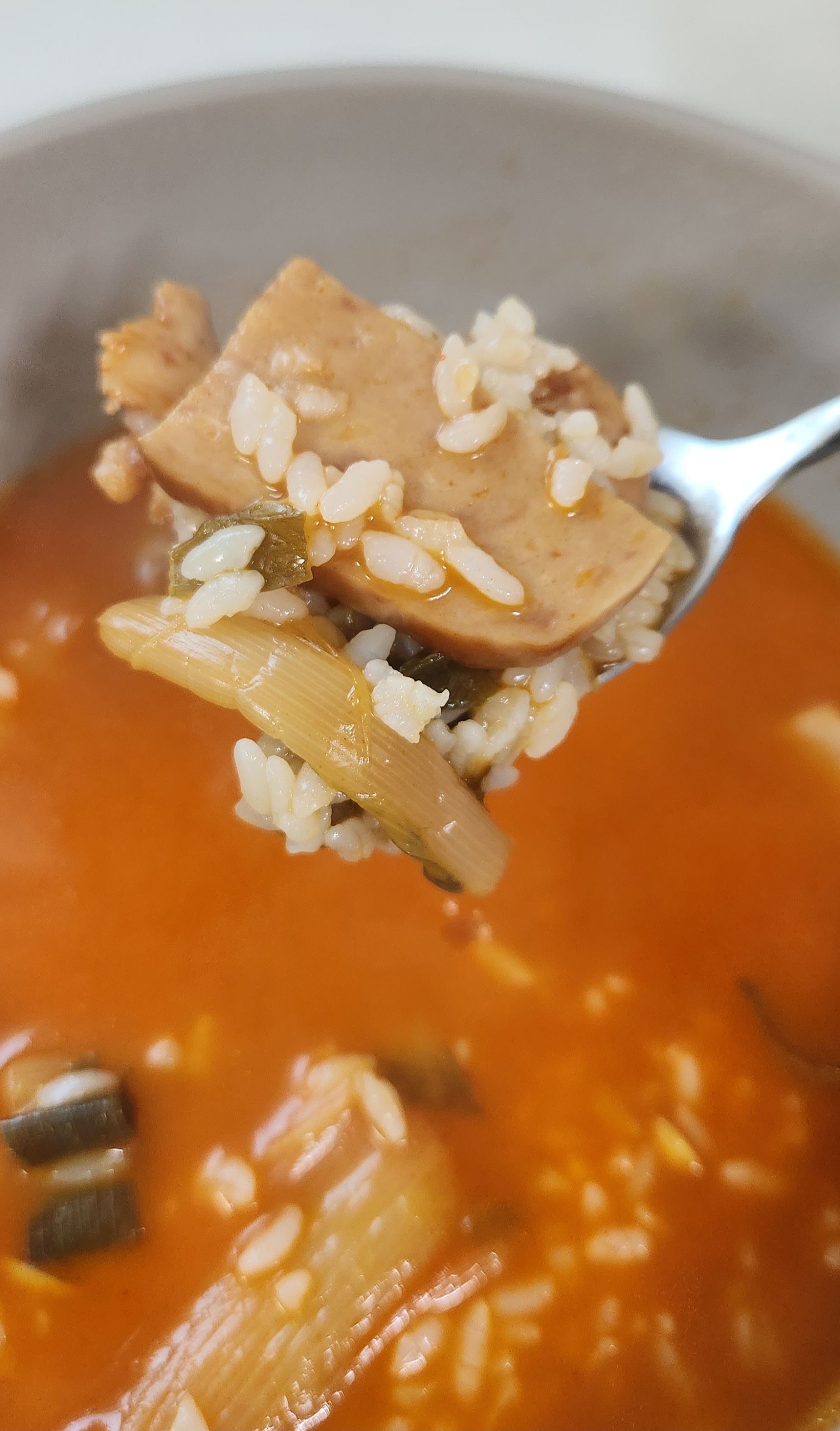 칼칼하거나 진하기보다는 맑고 깔끔한 부대찌개 국물 맛이다.