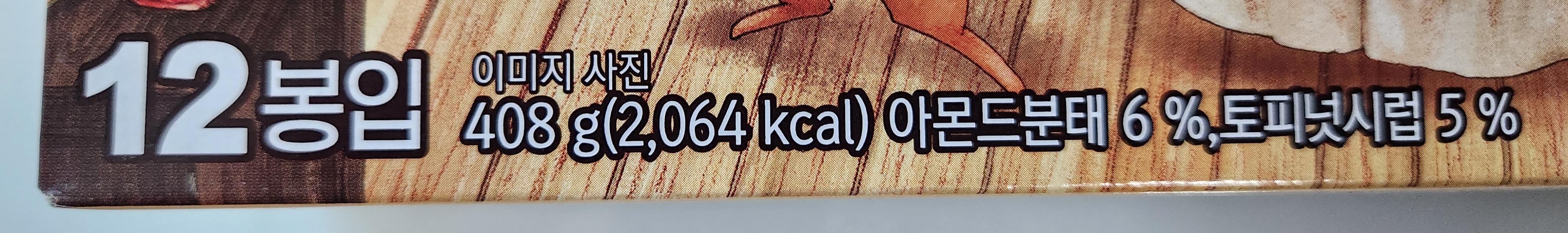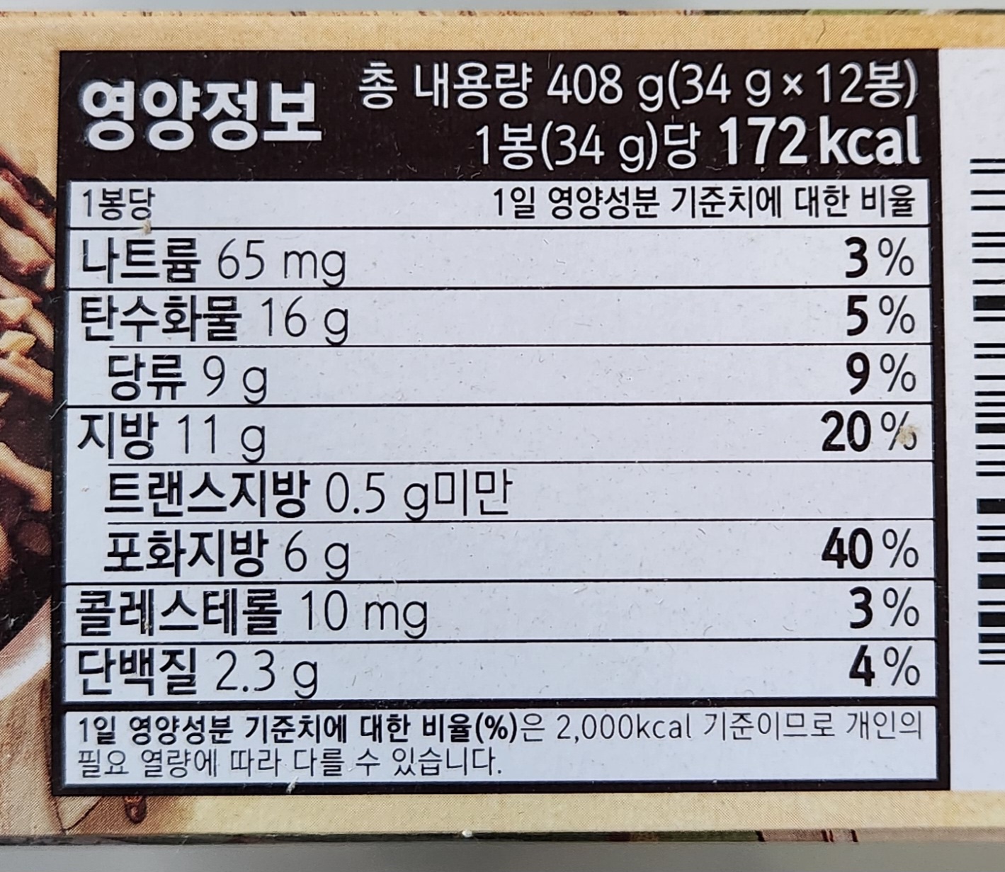 총 내용량은 408g, 칼로리는 1봉(34g) 당 172kcal.