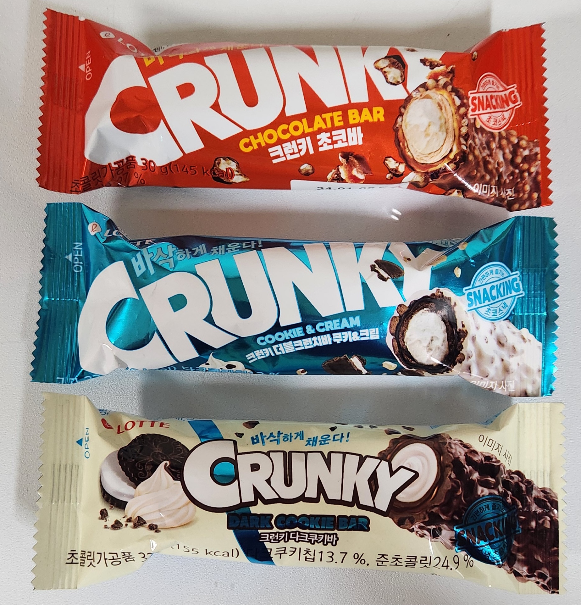 내 기준으로 순위를 매기자면 크런키 초코바 > 크런키 더블크런치바 쿠키&크림 > 크런키 다크쿠키바.