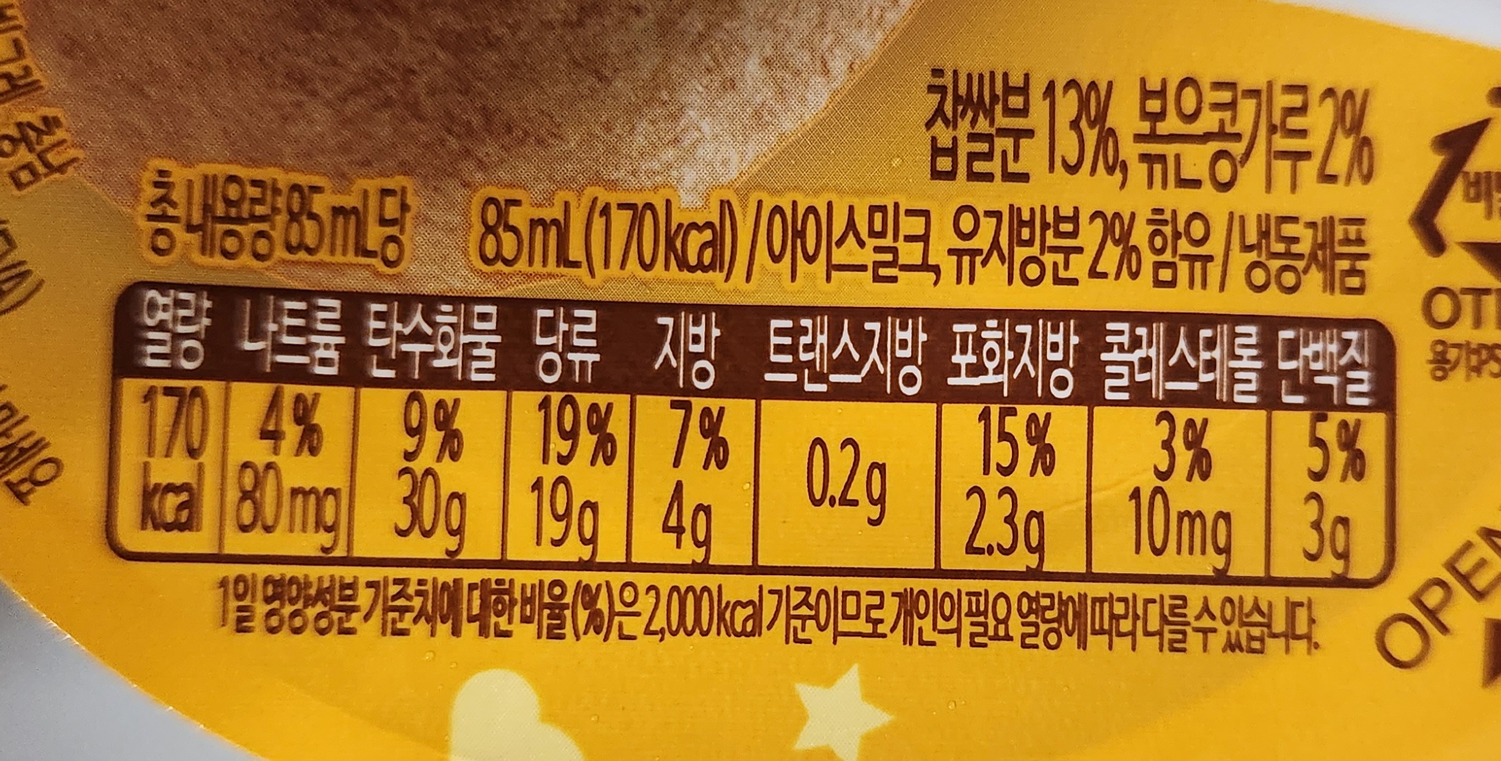 13% 포함된 찹쌀분은 아이스크림을 감싸고 있는 떡을 만드는 재료일 것이며,