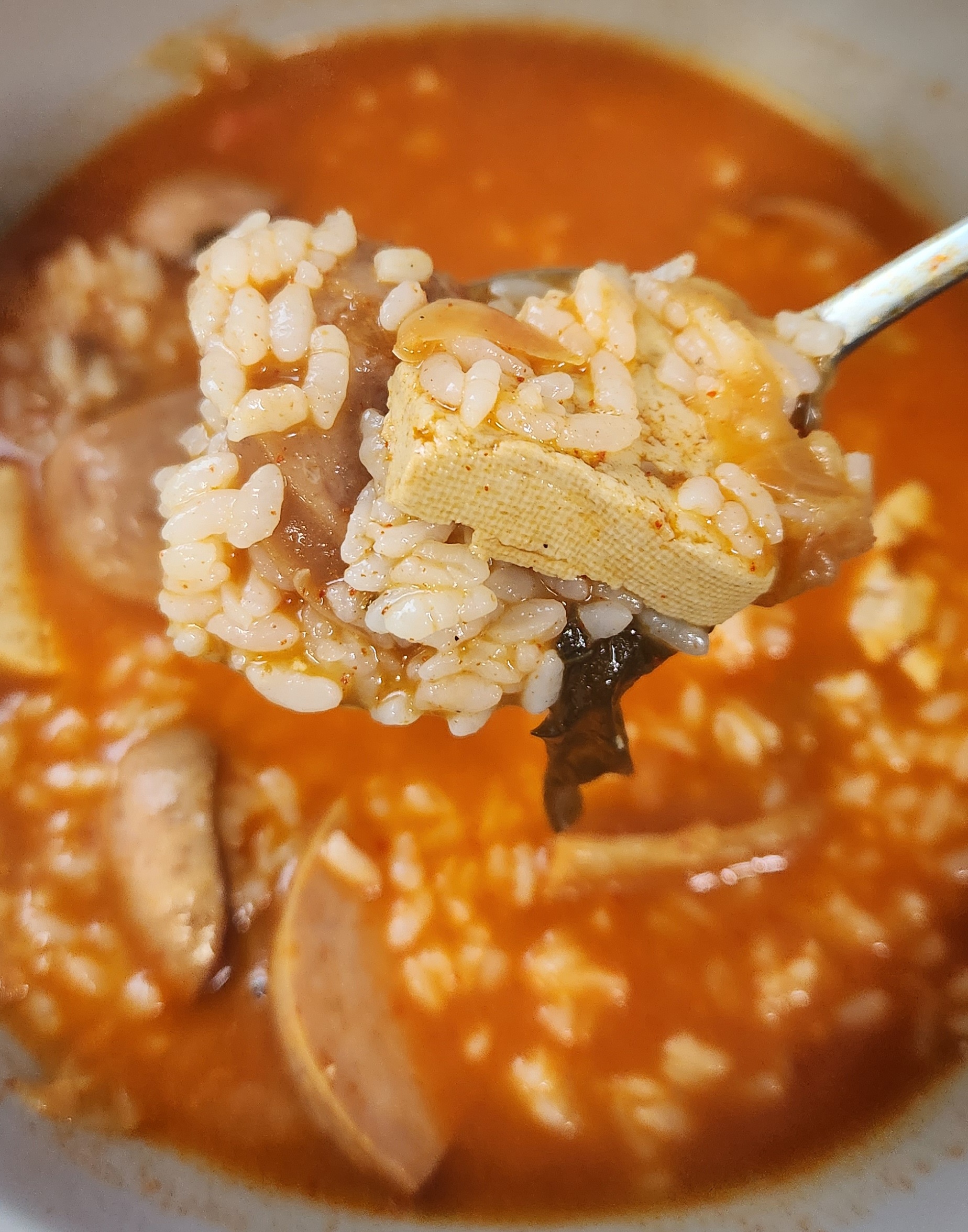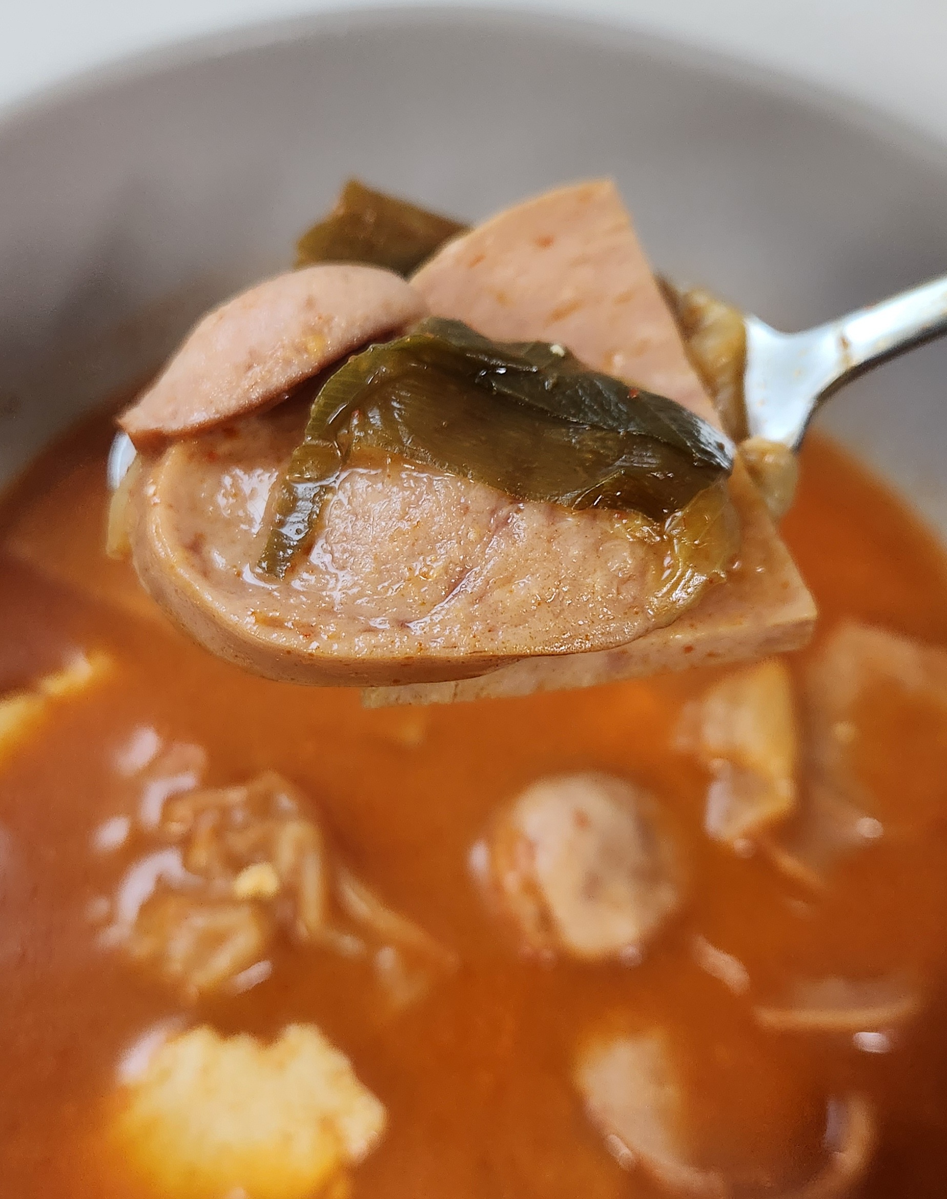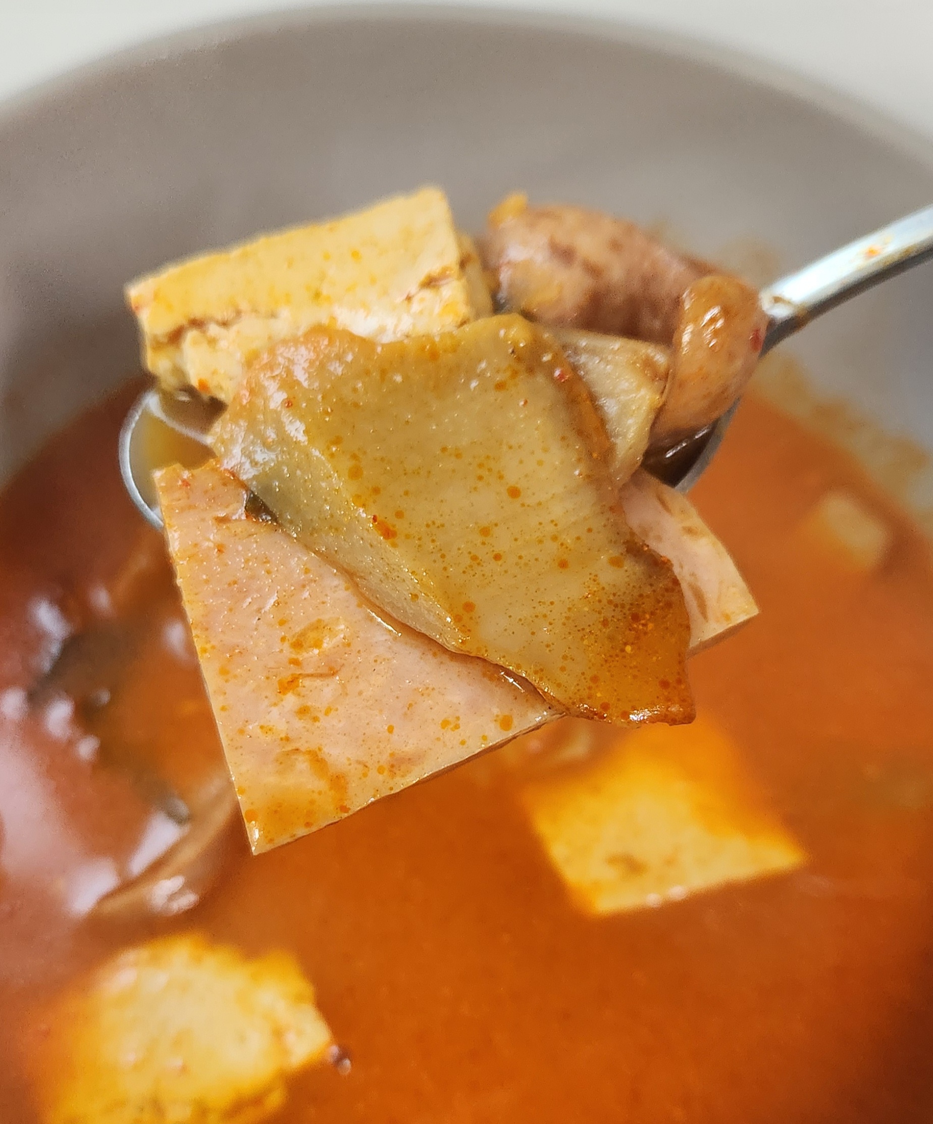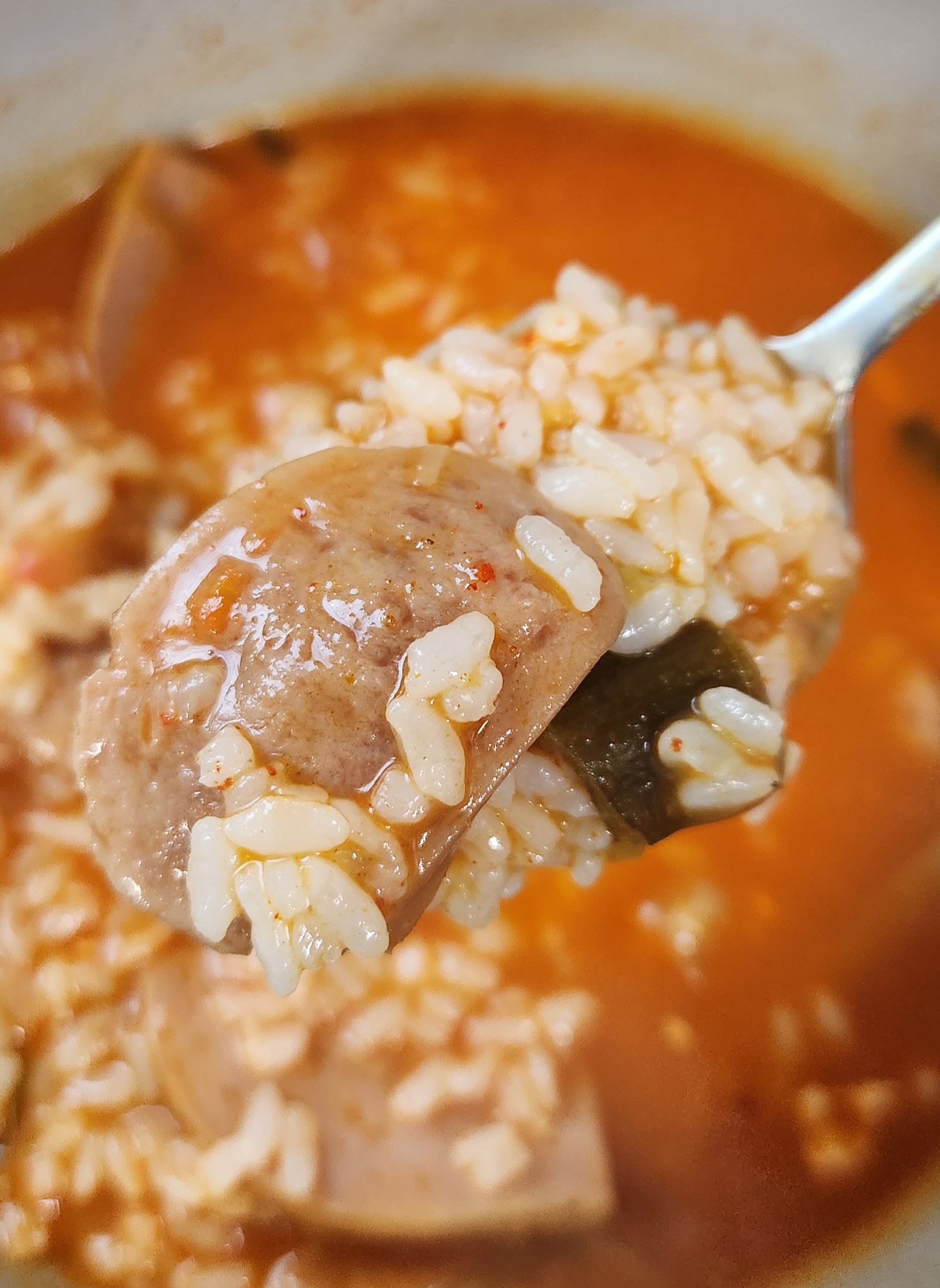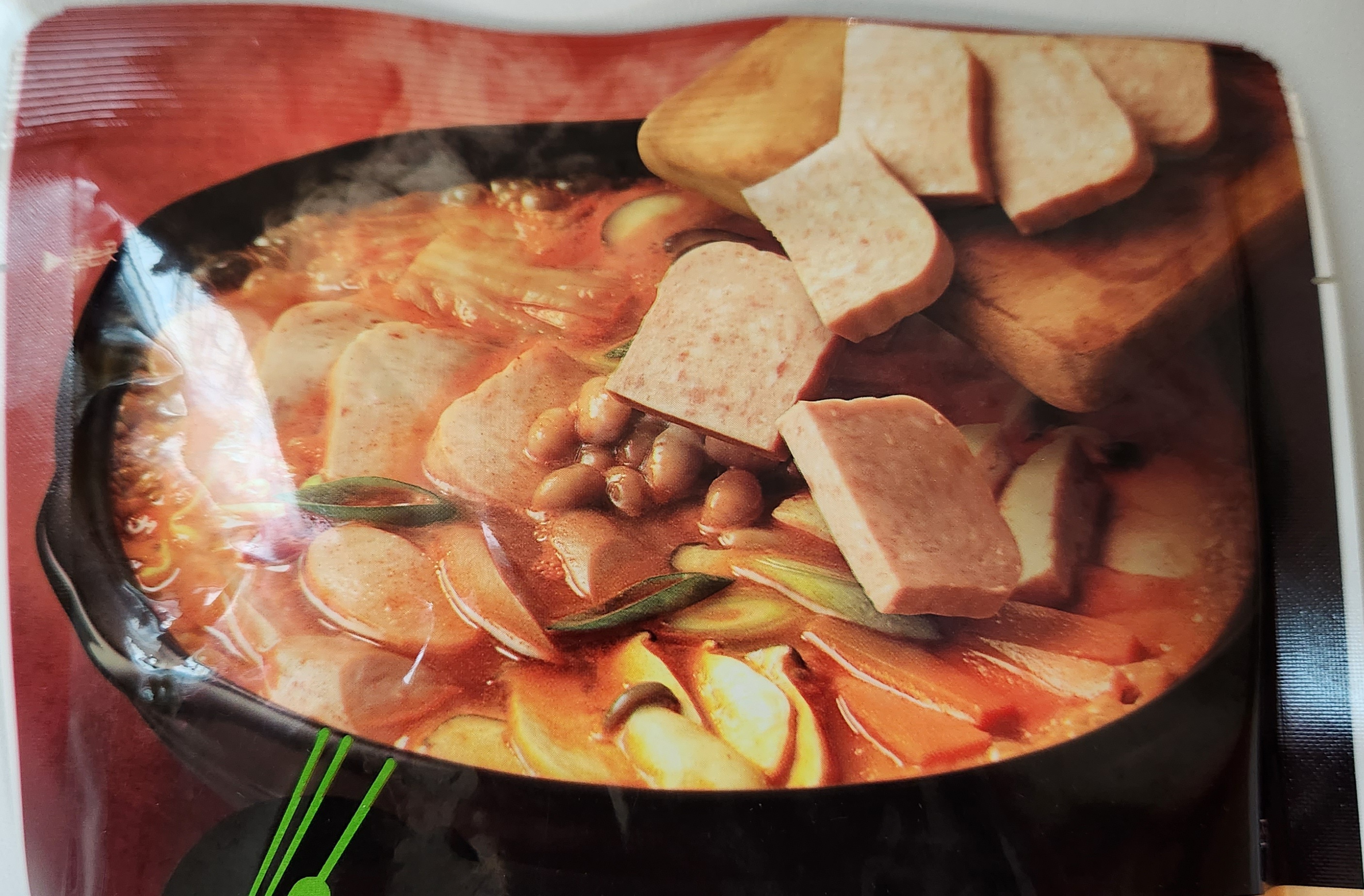 개인적으로 부대찌개 맛의 핵심은 재료로 쓰는 햄과 소시지의 퀄리티라고 생각한다. 그런 면에서 이 스팸부대찌개는 맛이 검증된 스팸 햄과 맛있는 부대찌개에서는 어김없이 들어가는 소시지를 써서 맛있는 부대찌개의 90% 자격요건을 충족.
