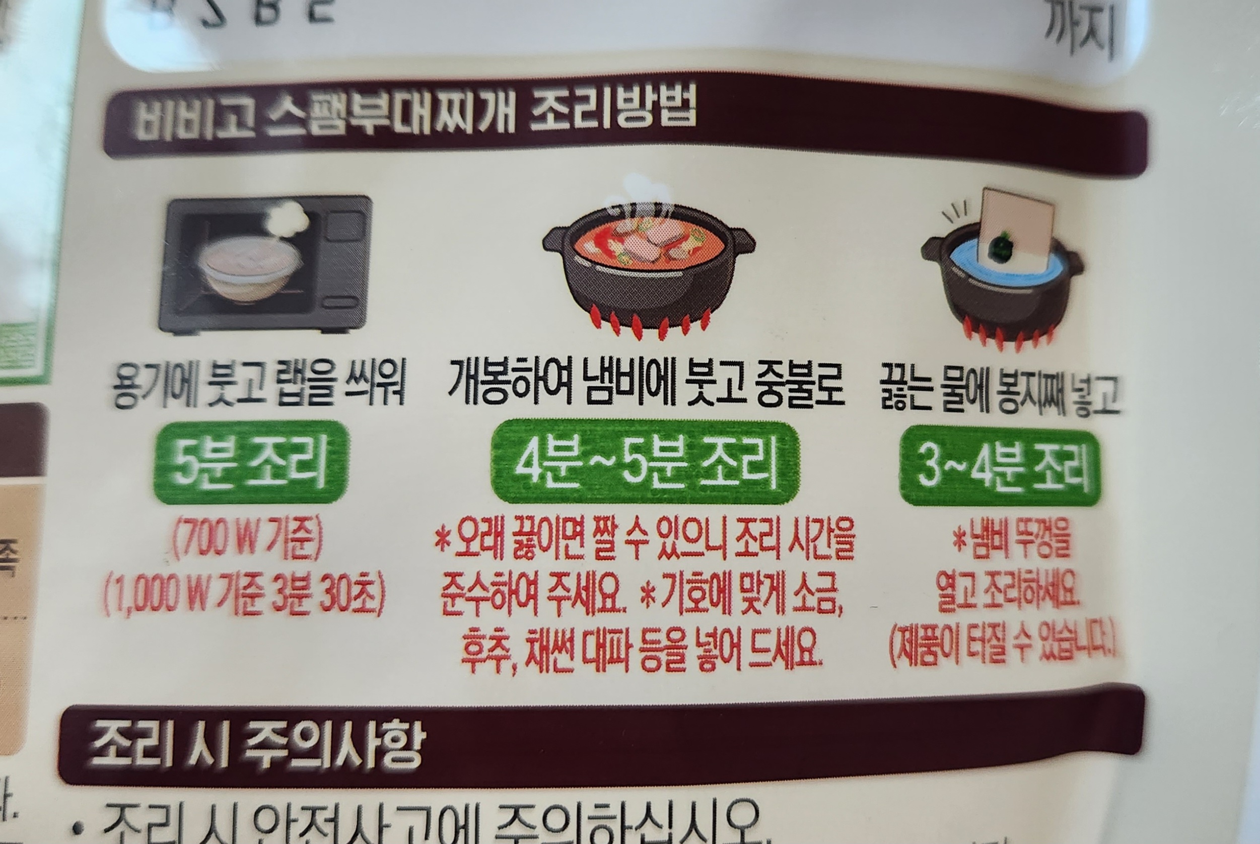 냄비 혹은 전자레인지에 조리가 가능하며, 봉지째 전자레인지 조리는 불가하다.