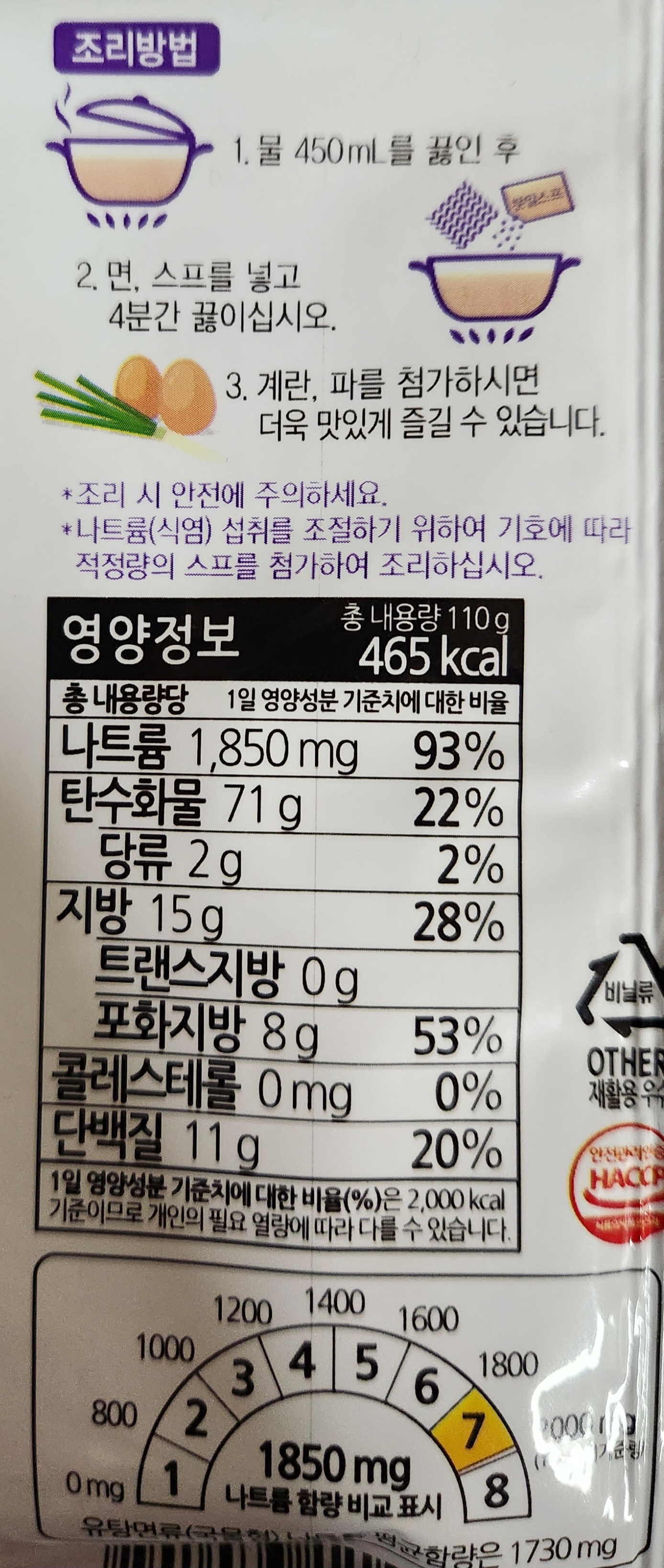 제품의 뒷면에 나와있는 조리방법 및 자세한 영양정보.