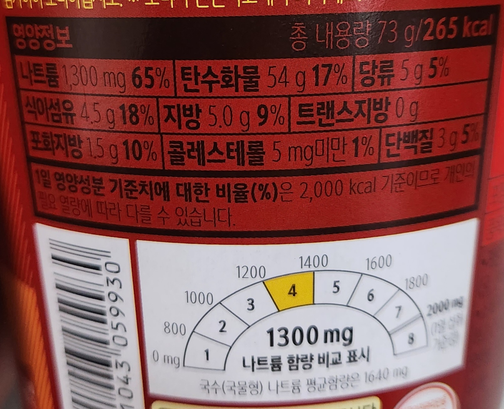 총 내용량 73g, 칼로리는 265kcal.