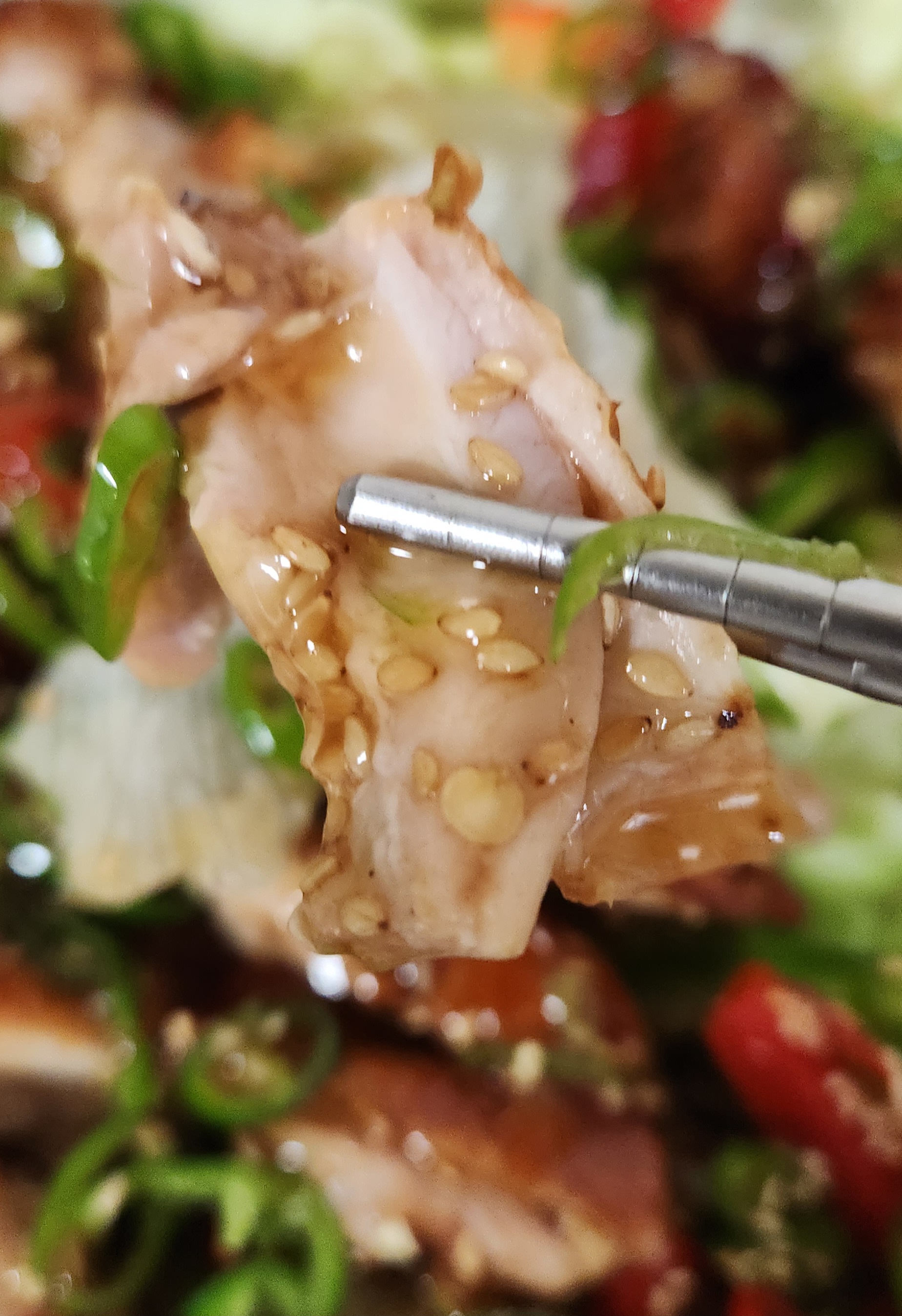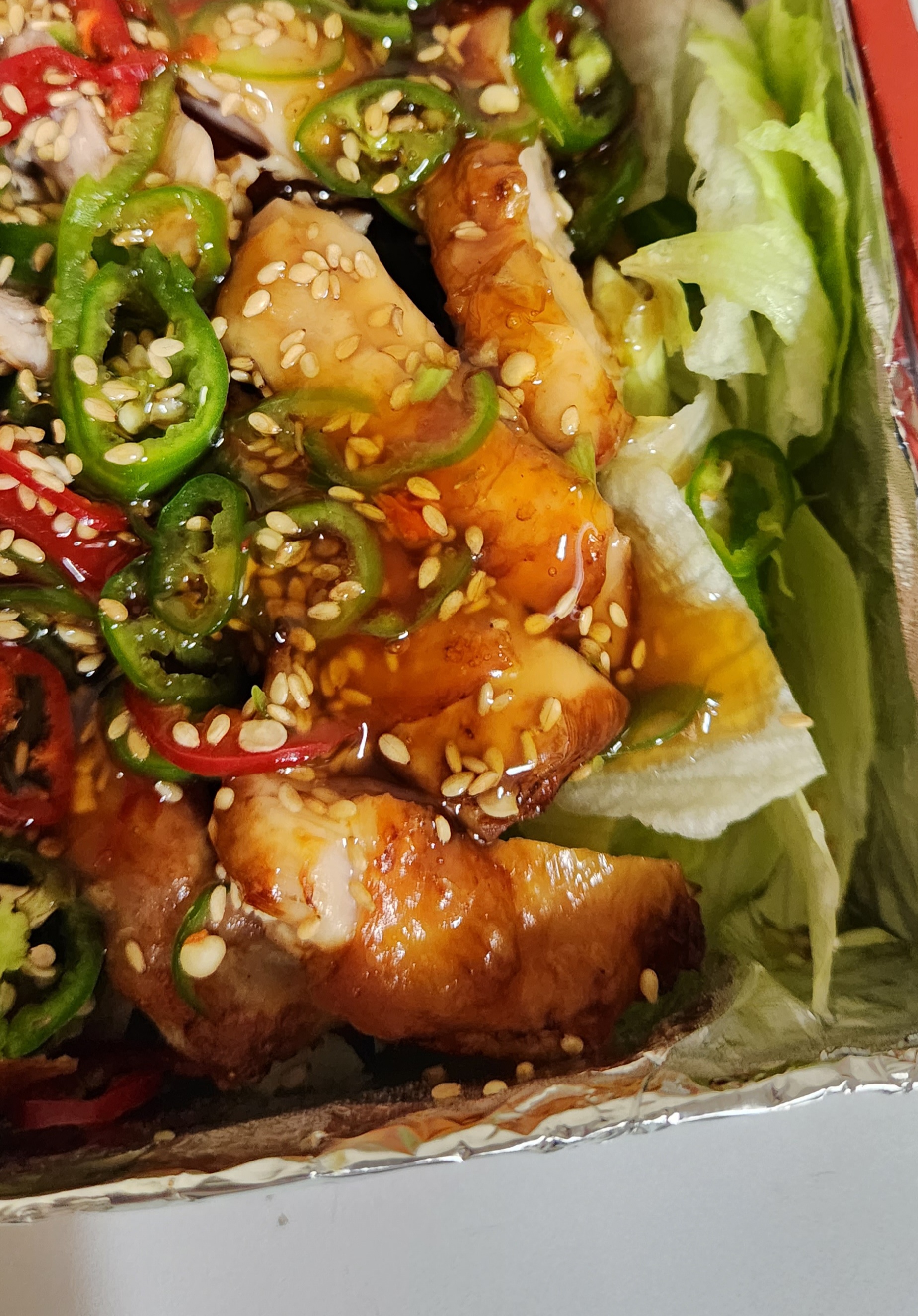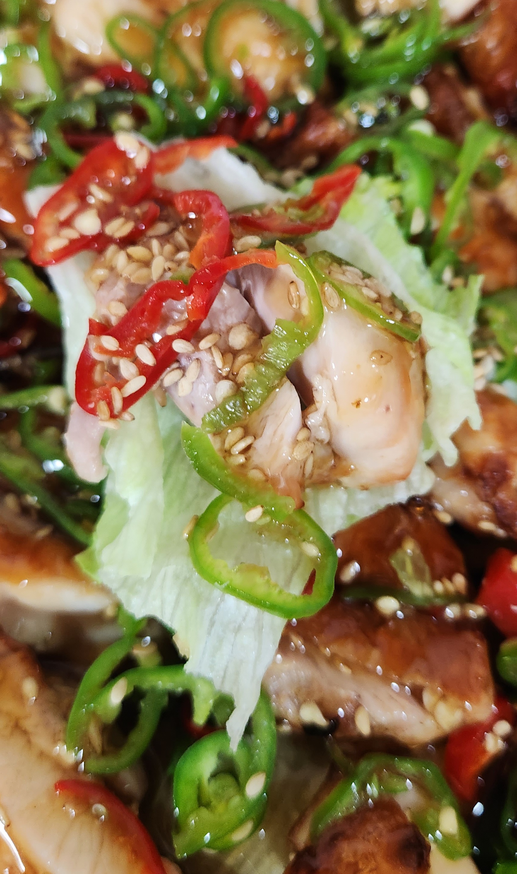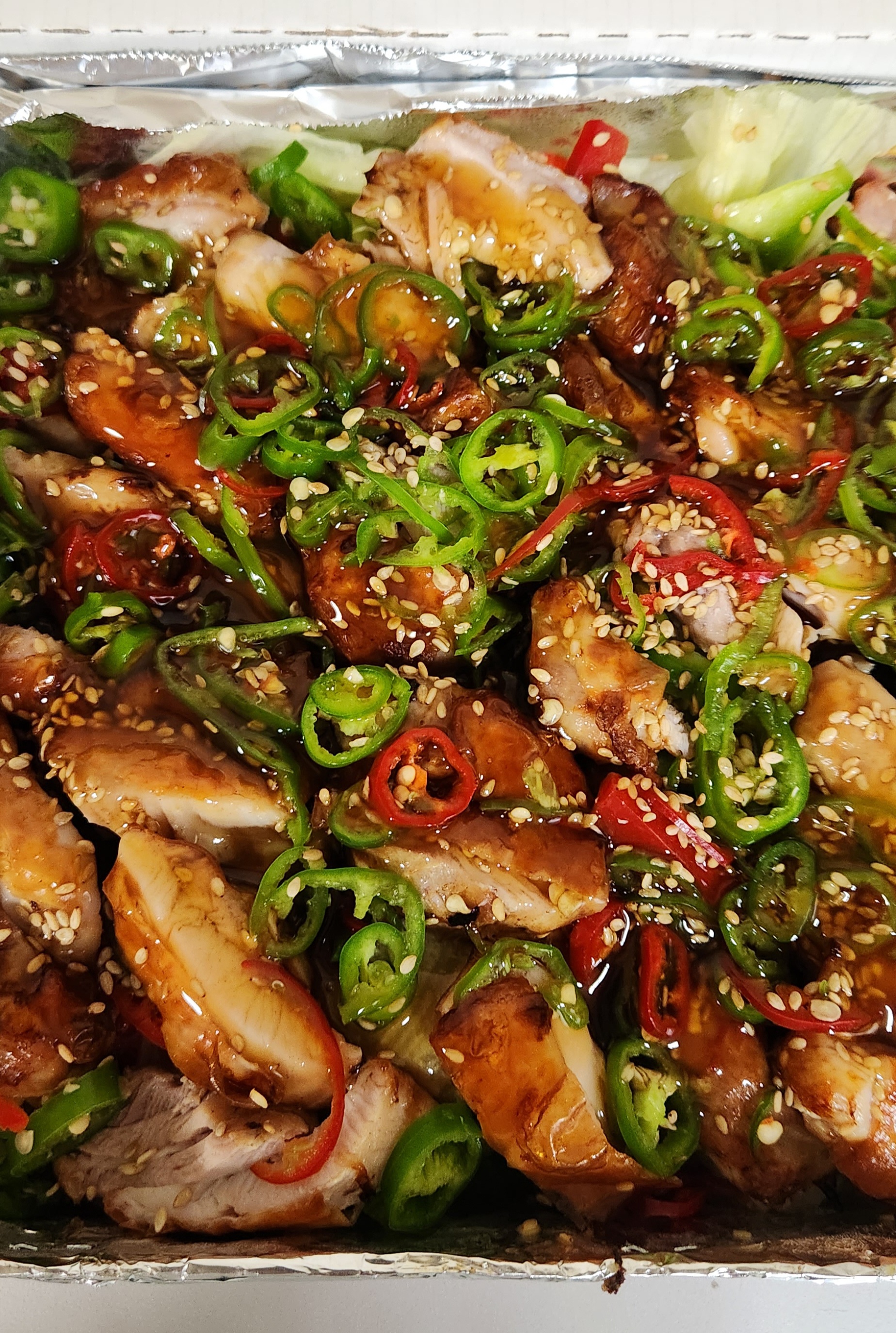 그 위에 치킨을 얹은 후, 고추, 피망 등을