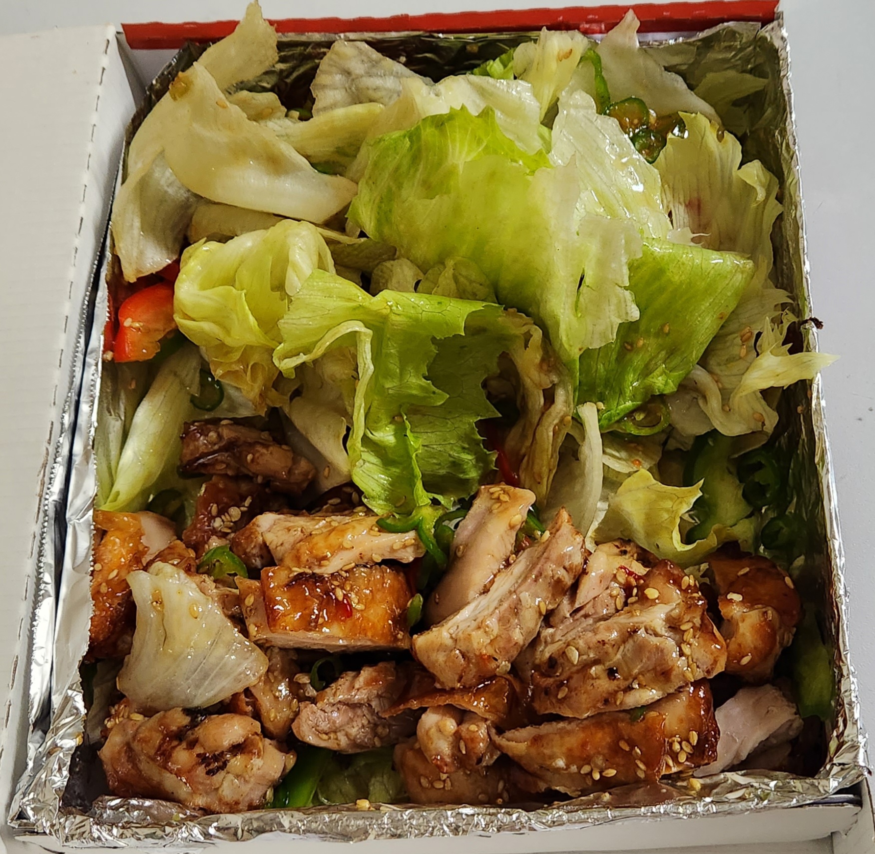 바닥에 양상추가 깔려있고 그 위에 순살 치킨,