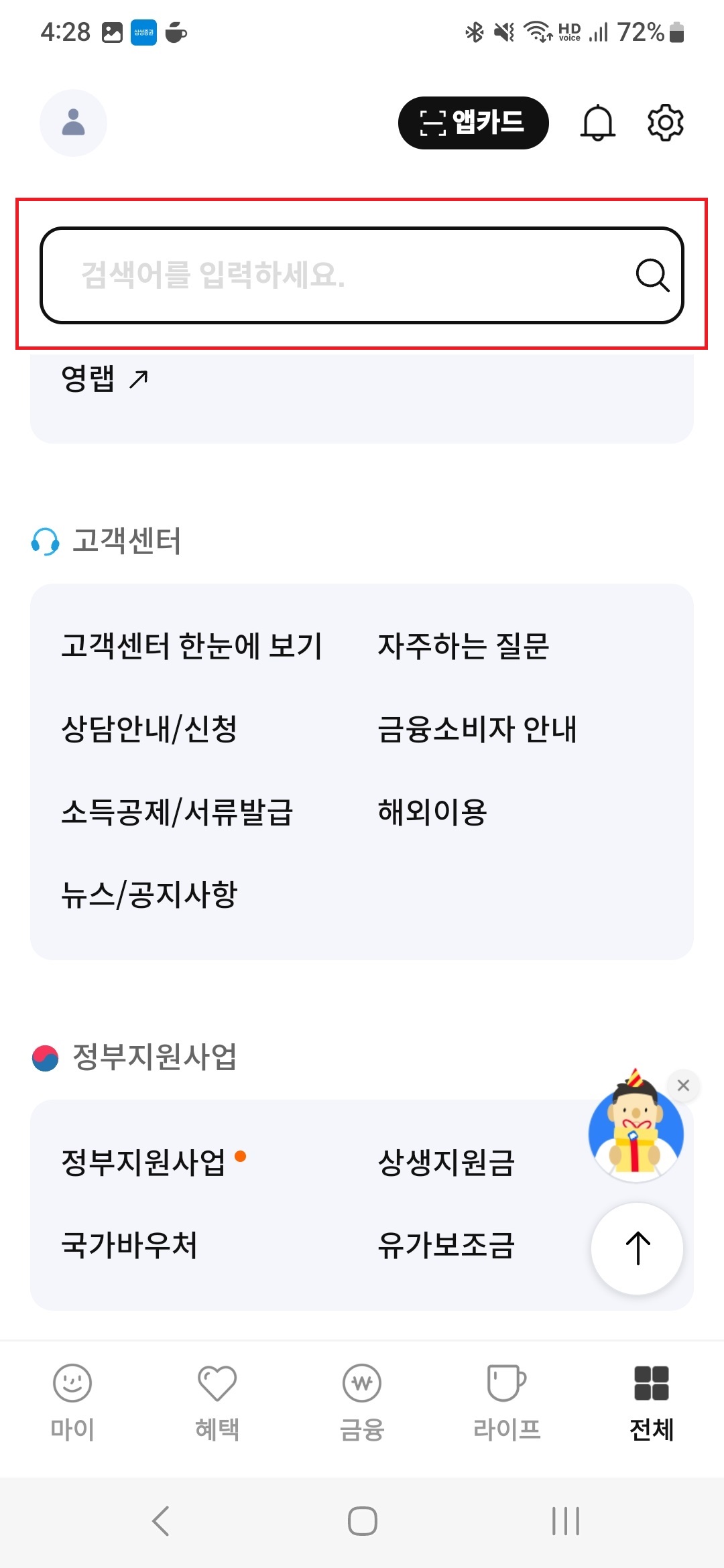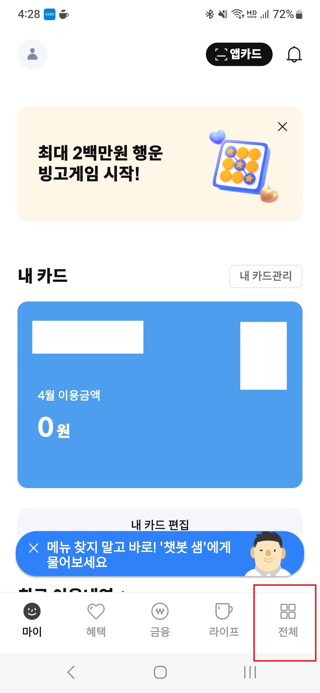 그 후 삼성카드 앱 메인 화면 우측 하단에 '전체'를 눌러 전체 메뉴 화면으로 이동합니다.
