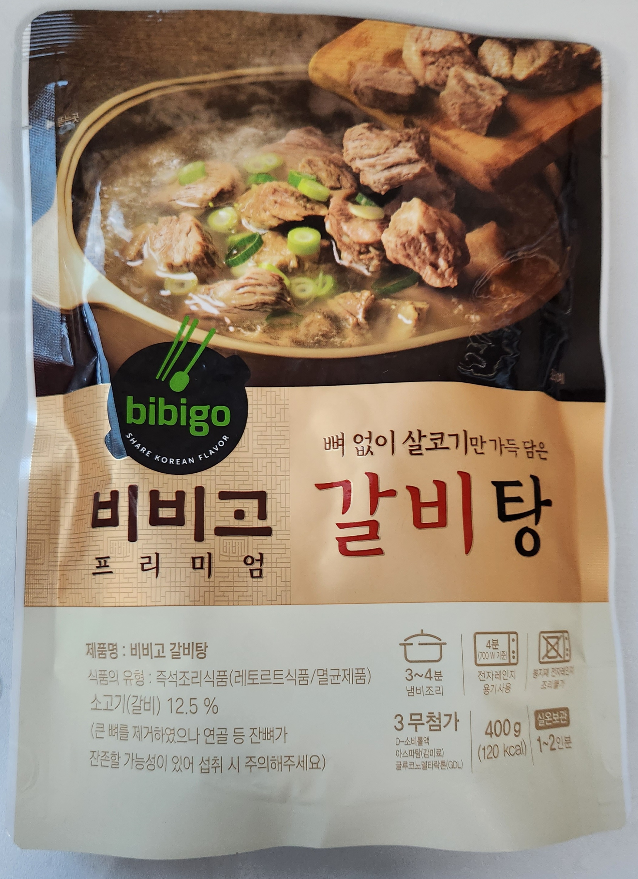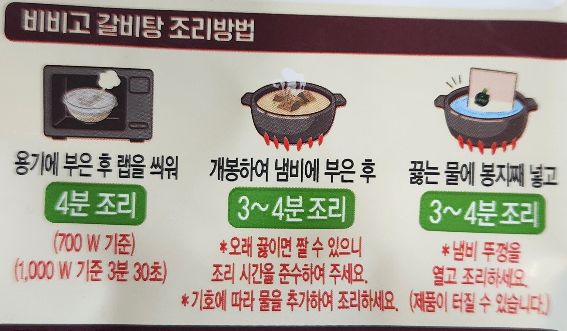 아래는 '비비고 프리미엄 갈비탕'의 제품 포장에 표시된 자세한 조리방법 및 영양정보 등의 추가 정보.