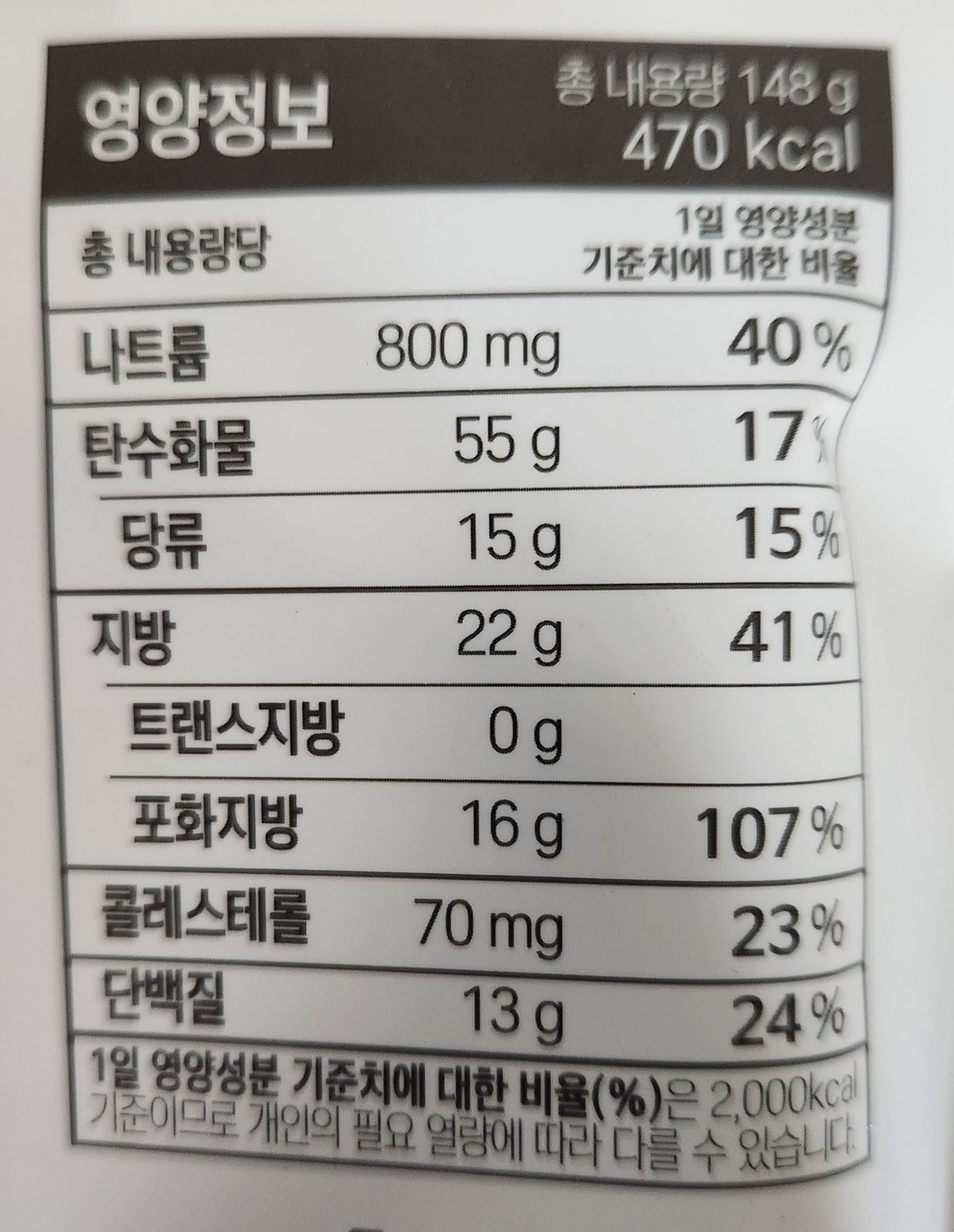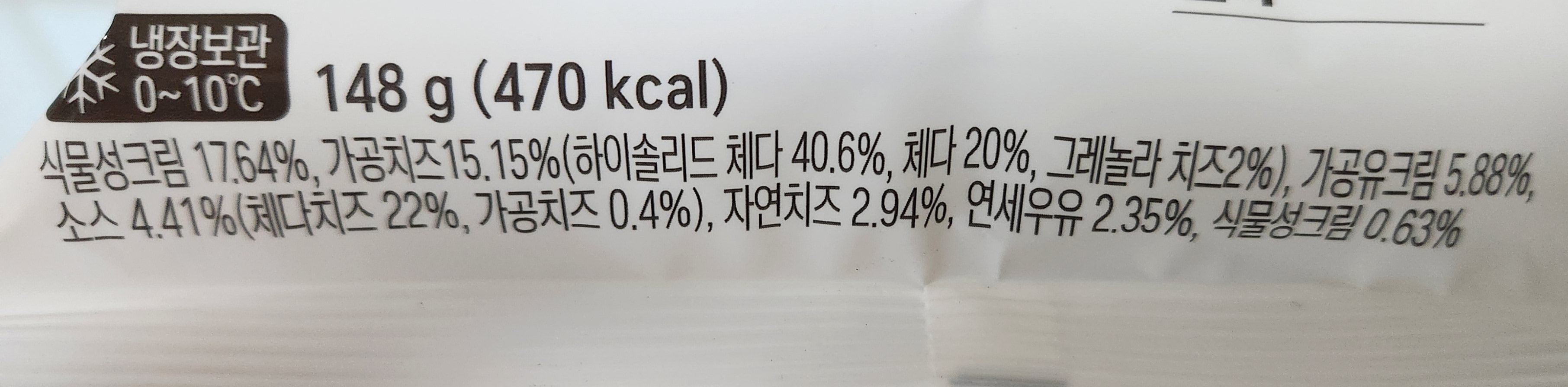 총중량은 148g이며, 칼로리는 470kcal. 식물성크림은 17.64% 함유되어 있으며, 자연치즈는 2.94%, 체다, 그레놀라 등의 가공치즈는 15.15% 함유되어 있다.