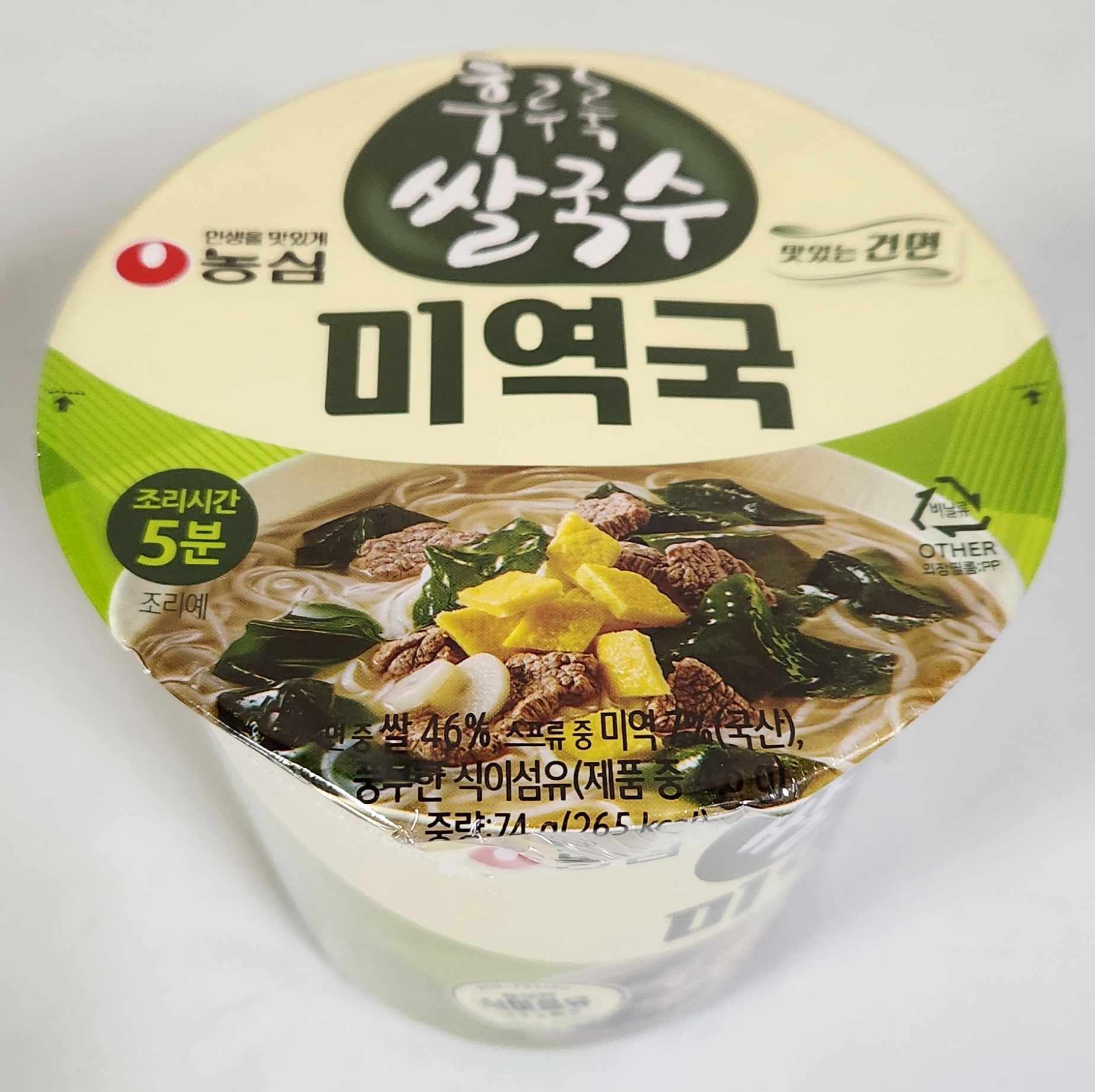 홈플러스에서 1,000원에 행사 가격으로 구입한 '농심 후루룩쌀국수 미역국'. 행사 전에는 1,460원에 판매를 하던 제품인데 구입처에 따라서 가격이 조금씩 다르다. 지난 번에 후루룩쌀국수 시리즈 중 다른 제품인 '소고기장국' 맛을 먹어봤는데 충분히 먹을 만했지만 강추할 만한 맛은 아니었다. 결론부터 말하자면 이 미역국 컵라면은 강추다.