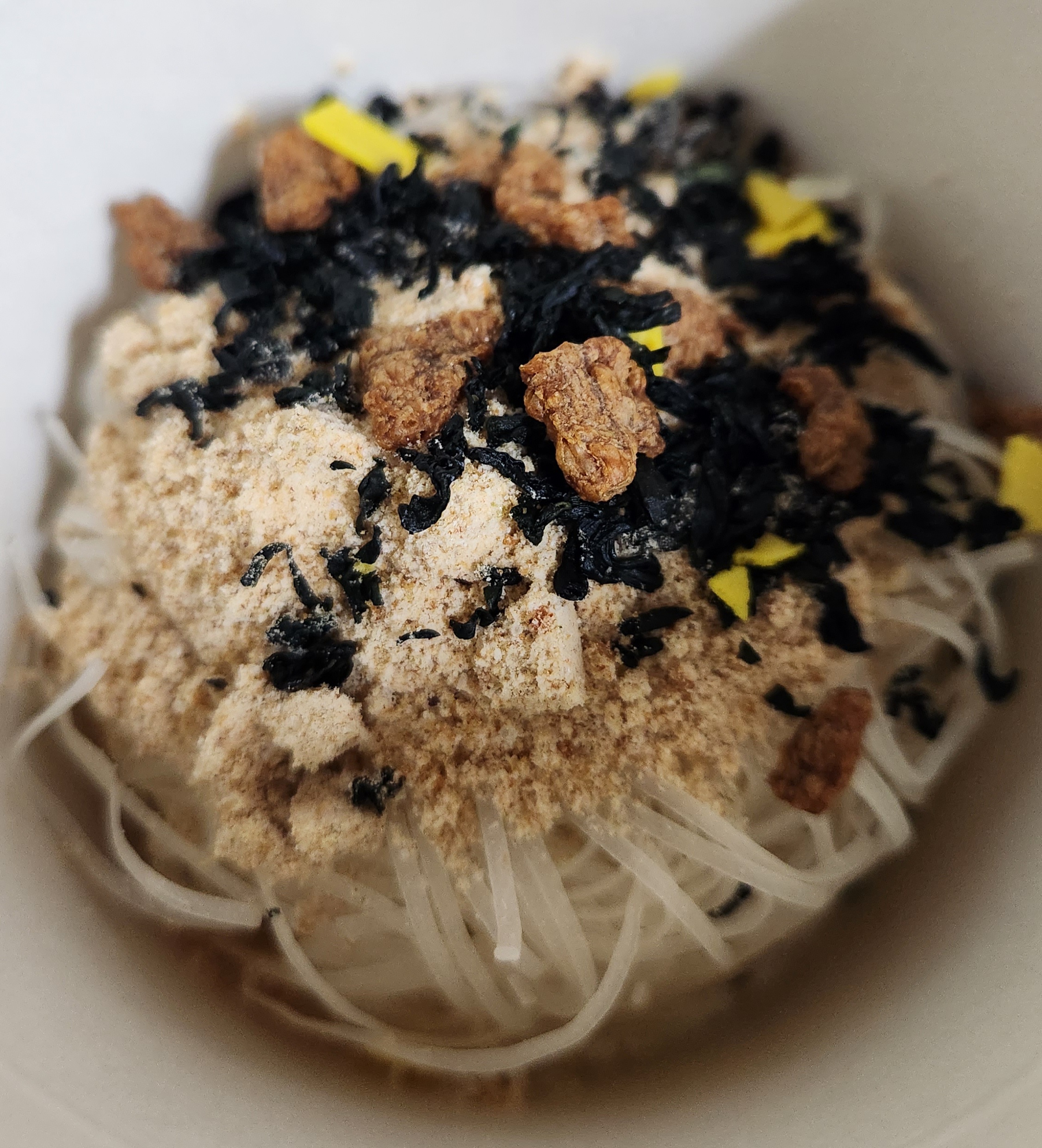 쌀국수 건면에 분말스프와 후레이크를 부은 모습.