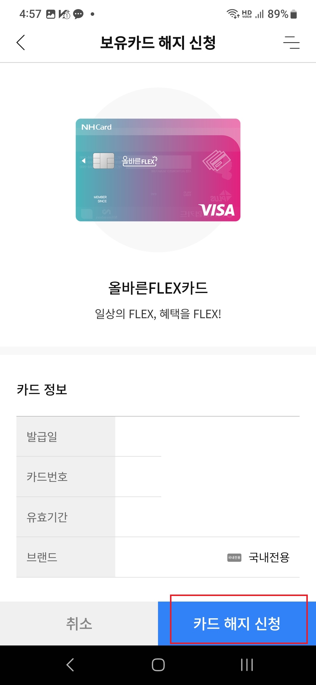 6. 해당 신용카드에 대한 간략한 정보가 나오고, 화면 아래 '카드 해지 신청'이 보입니다. 눌러서 해지 신청을 진행합니다.