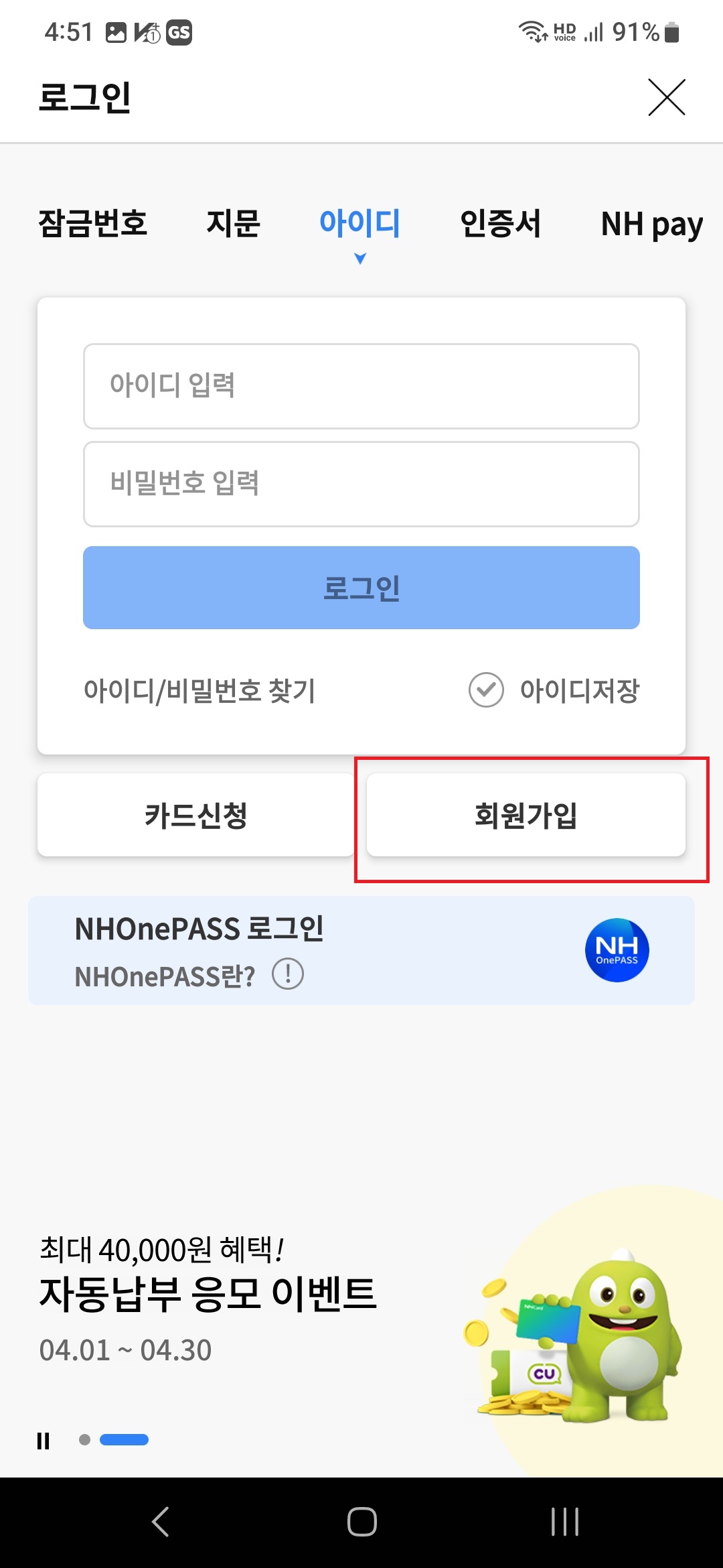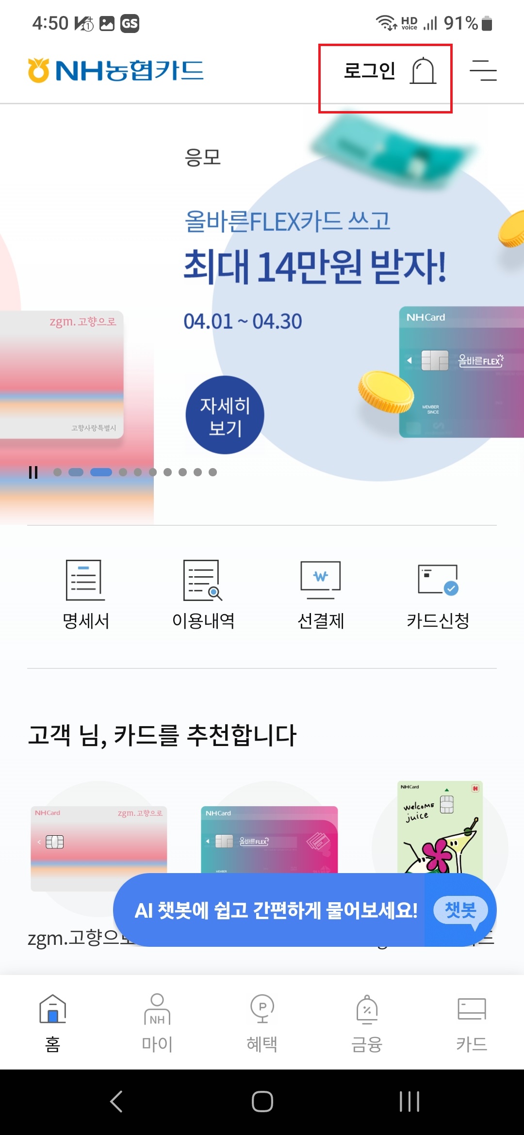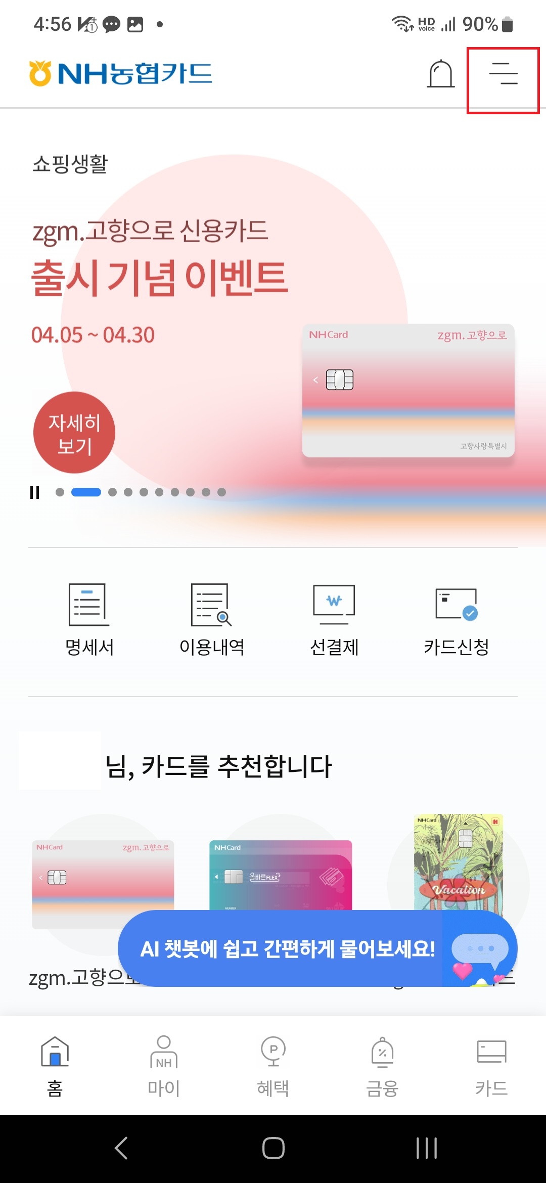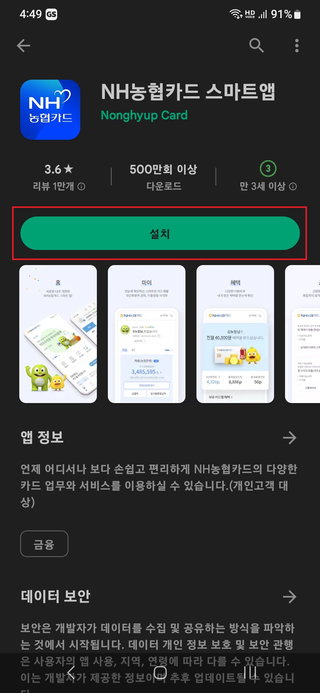 1. 먼저 'NH농협카드 스마트앱'을 다운로드해 줘야겠죠? 다운로드한 후 앱에 들어가줍니다.