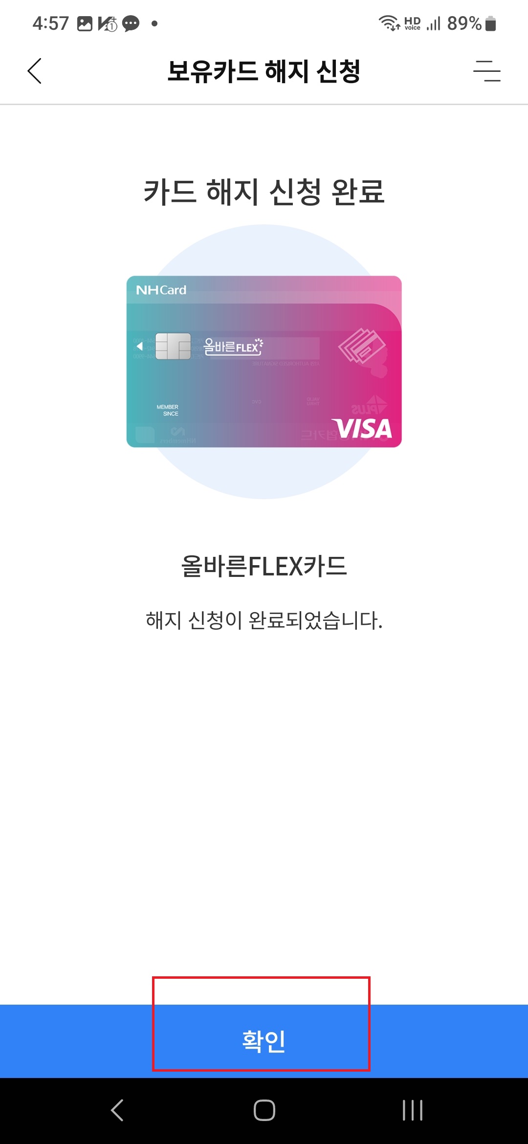 7. 재확인하는 차원에서 카드 정보를 보여주고 마지막으로 '카드 해지 신청'을 재차 눌러주면 NH농협카드 신용카드 해지 신청이 완료되었다는 화면이 나오고 여기에서 '확인'을 한 번 더 눌러주면 해지 신청을 완료할 수 있습니다.