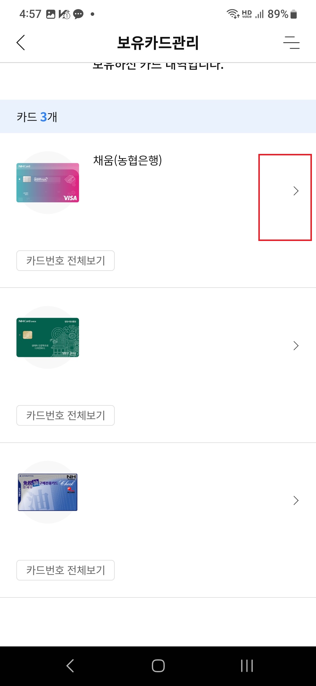 5. 그러면 현재 NH농협에 본인이 소유하고 있는 신용카드, 현금카드 등의 목록이 나옵니다. 해지를 원하는 카드의 우측 화살표를 눌러 입장해 줍니다.