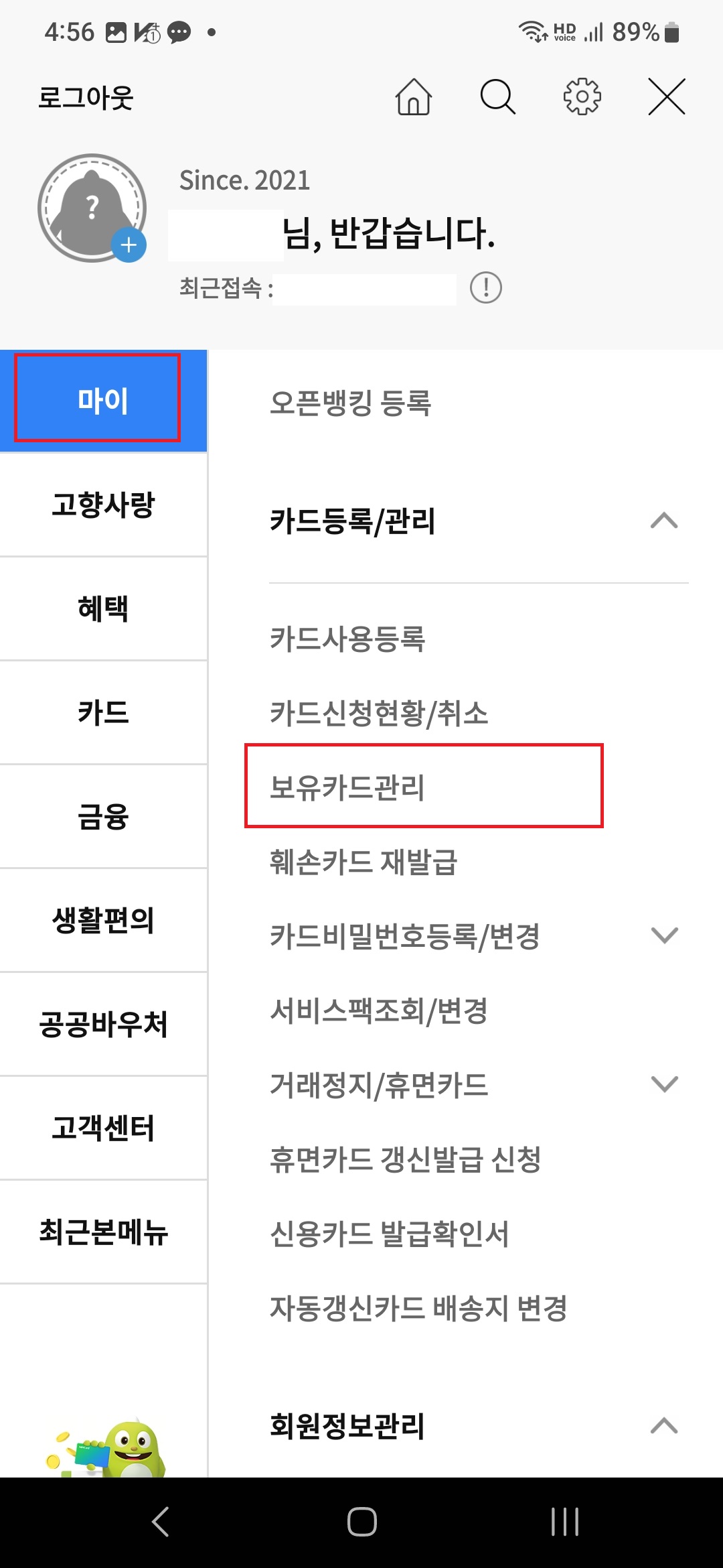 4. 좌측 메뉴 중 '마이' 메뉴에서 아래로 스크롤 해서 내려가다 보면 '카드등록/관리' 하위 메뉴 중 '보유카드관리'가 보일 것입니다. 여기를 눌러 입장해 줍니다.