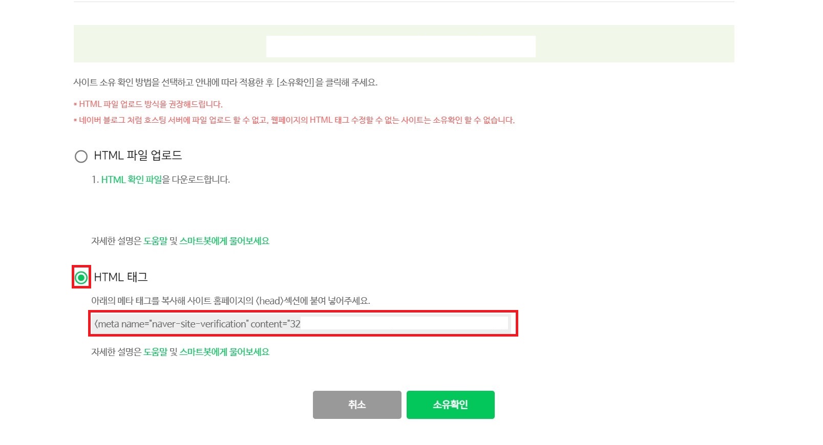'HTML 태그'를 선택한 후, 아래 메타 태그를 복사(Ctrl + C) 하고 내 티스토리의 관리 페이지로 이동합니다. 네이버 서치어드바이저는 다시 돌아와야 하니 닫지 마시고 일단 최소화해 둡니다.