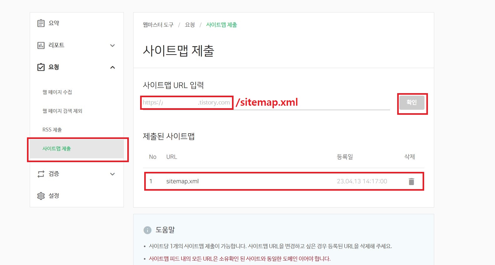 요청 내 '사이트맵 제출'을 클릭하여 아래 화면과 같이 '사이트맵 URL 입력' 칸에 본인의 티스토리 블로그 주소를 입력하고 추가로 '/sitemap.xml'을 입력해 준 후 '확인'을 클릭해 줍니다. 아래 '제출된 사이트맵'에 방금 입력한 주소가 추가되었다면 사이트맵 제출이 완료되었습니다.