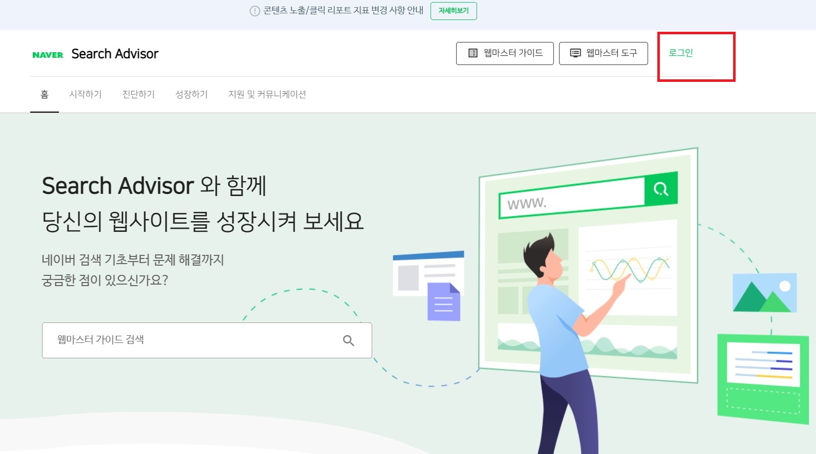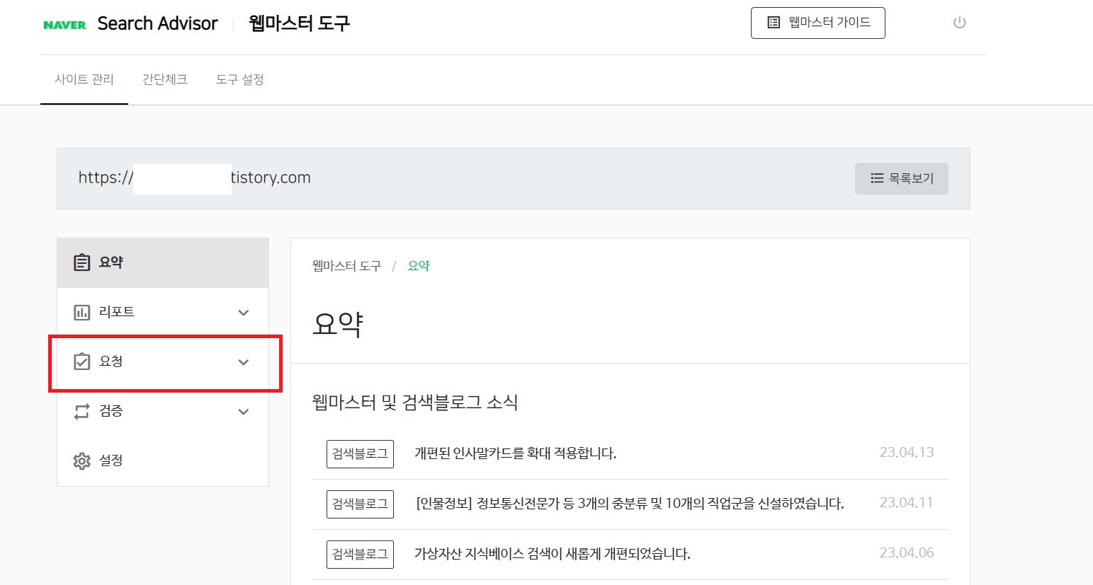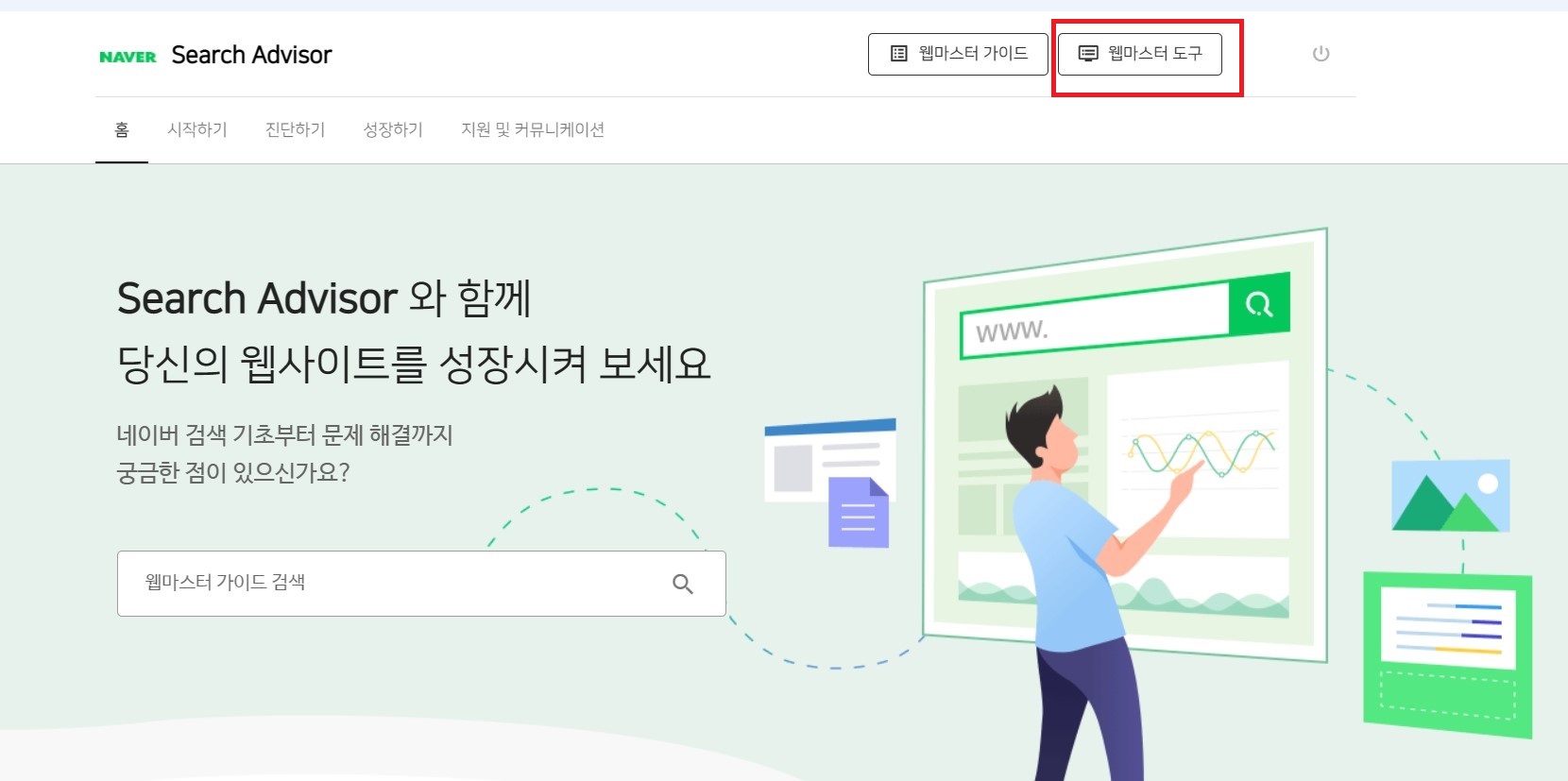 이후 네이버 서치어드바이저 메인 화면 우측 상단에 있는 '웹마스터 도구'를 클릭하여 이동합니다.